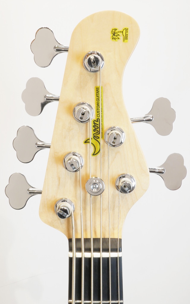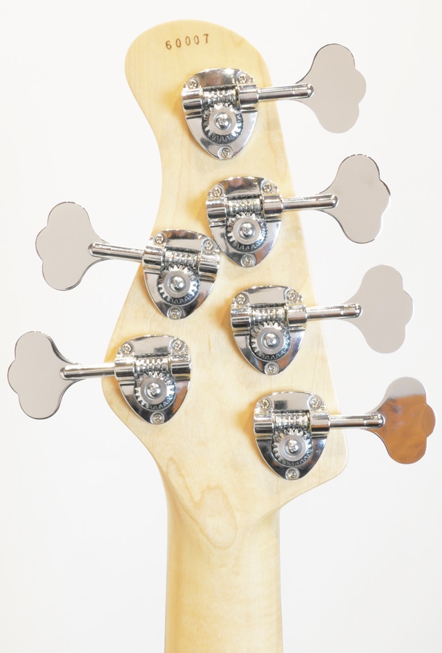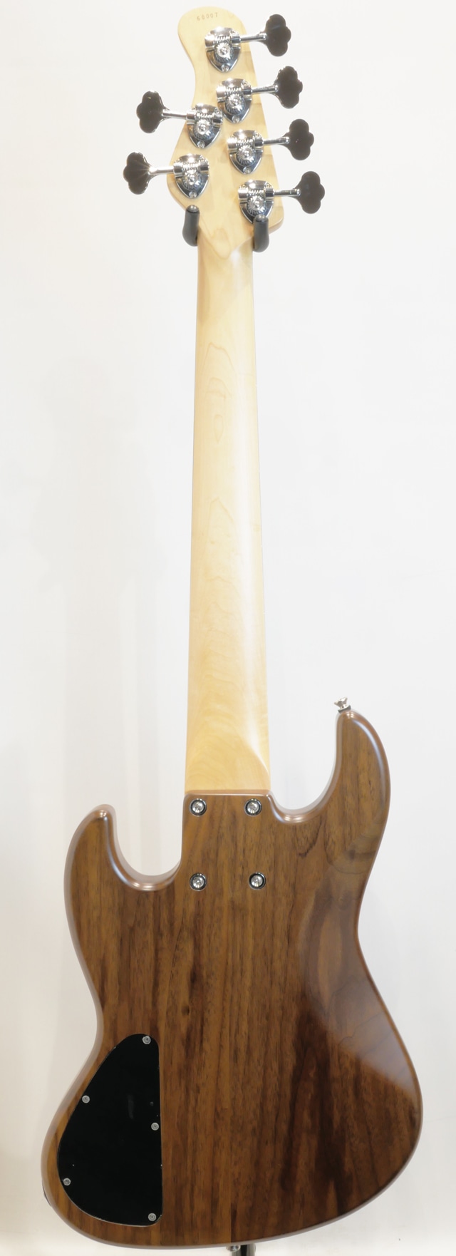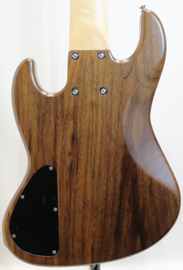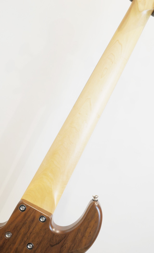 本機はウォルナットボディ、メイプルネック、エボニー指板、ピックアップには「JJ-6」の生産のためにデザインされた「Oxalis JB6」モデル、プリアンプは「Bartolini XTCT」を搭載した2EQ仕様、ヘッドデザインはコンパクトに纏められペグは4対2に配置されておりヘッド側への荷重を極力抑えた仕様となっておりますが、本体総重量は約5.76kgとウォルナット材の特徴を存分に有したウェイト持っておりボディの重厚さが最大の特徴でしょう。