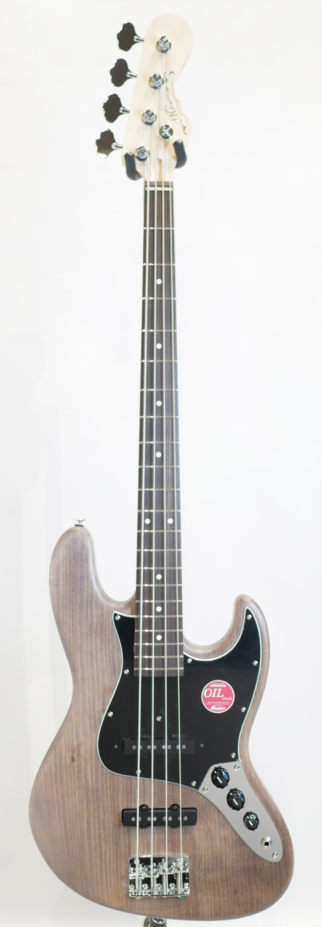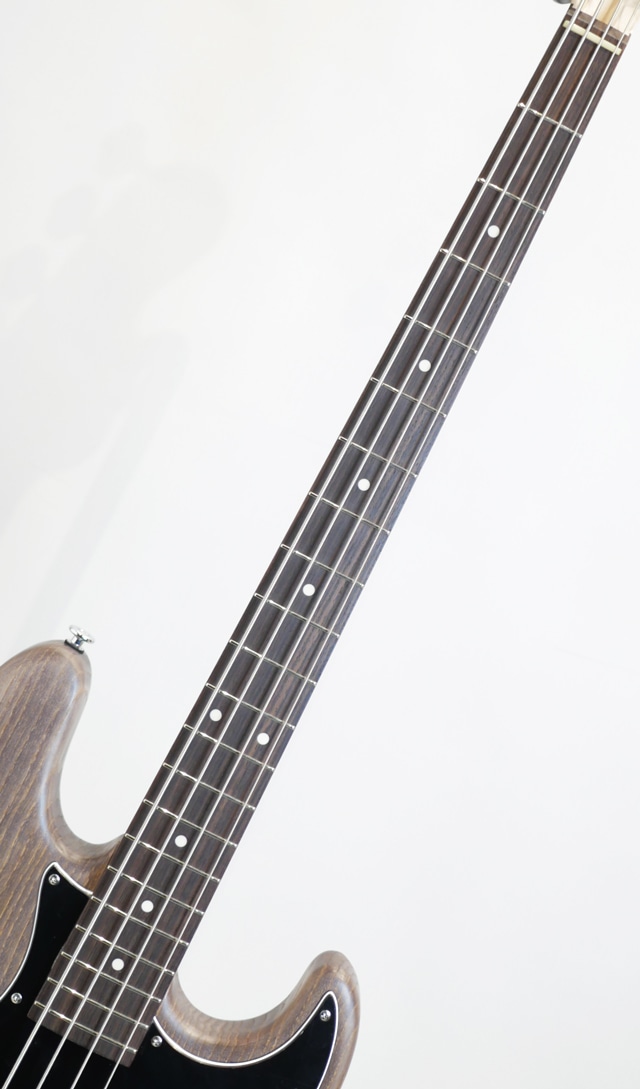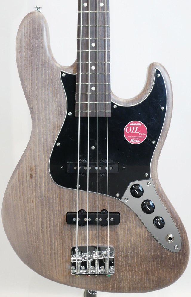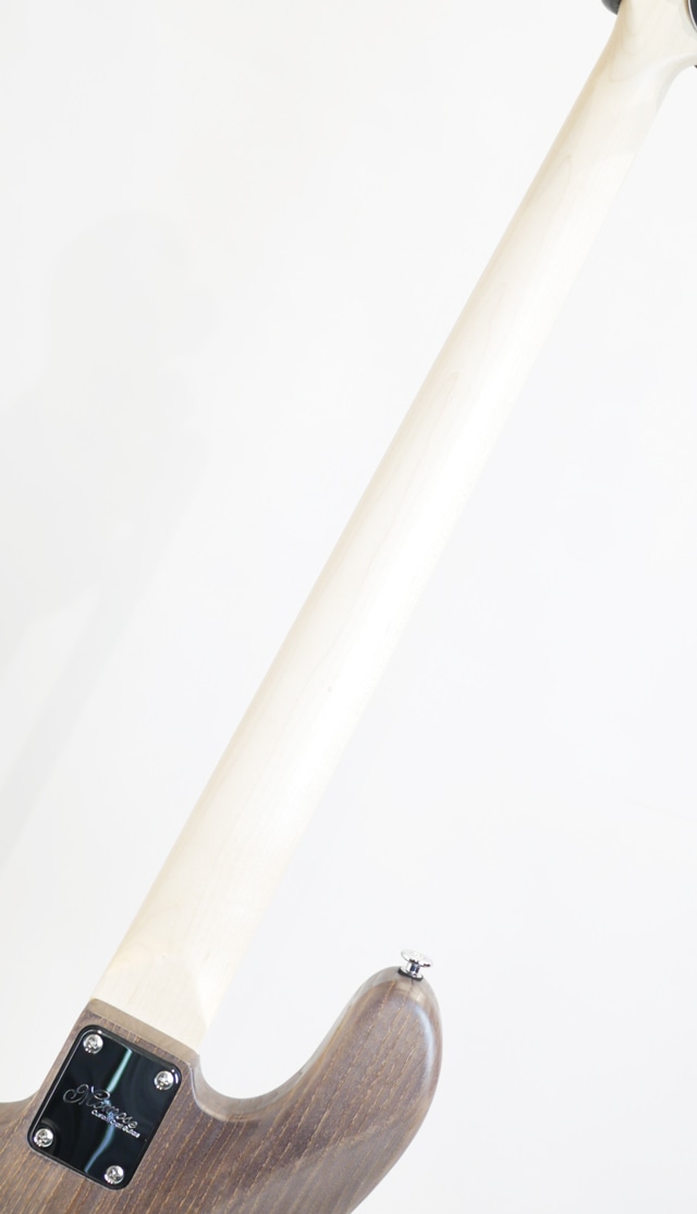 当機はアッシュボディ、メイプルネック、ローズウッド指板で構成。アッシュ材の豊かに鳴るレンジの広さと音の芯がはっきりと太く感じ取れる中低域、押弦とピッキングタッチのしなやかな感触から生み出されるカラッと響く上品な低音とクリアな高音域を備えたベーストーンを出力します。丹念に磨き上げ、極薄の着色で仕上げられるオイルフィニッシュもあってより木材本来の鳴りと言える様なやや深みの増した印象もあり柔和でしなやかなロートーンがお楽しみ頂けます。