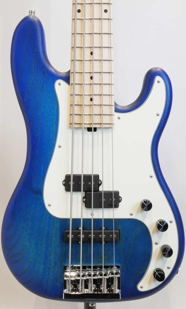 本機は、スワンプアッシュボディ、メイプルネック&メイプル指板、レギュラーサイズのPBシェイプ(Classic P)にてオリジナルP/Jピックアップを配した“Sadowsky”のPJ5弦モデルです。PBシェイプの4弦P/Jモデル、JBシェイプの5弦P/Jモデルは比較的目にする機会が多い事と思いますが、PBシェイプでの5弦モデルはNYCモデルを除いては非常の珍しく、さらに中空構造のチェンバードが主流の”Metroline”にてソリッドボディが採用されたモデルとなります。