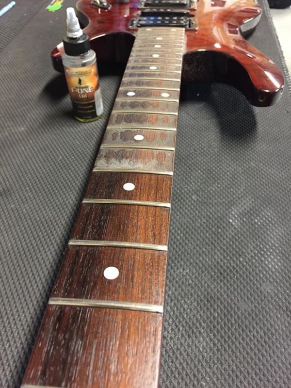 ・指板に塗った後余ったオイルはふき取ってください。余分なオイルが残っているとべた付き等の原因となります。