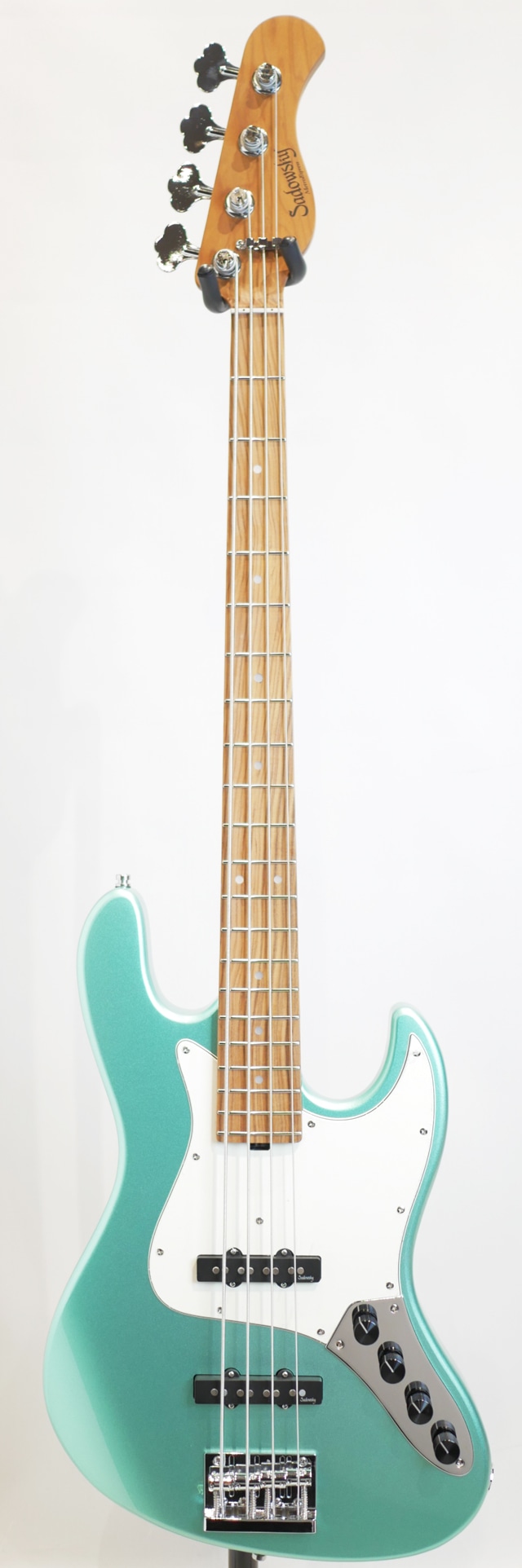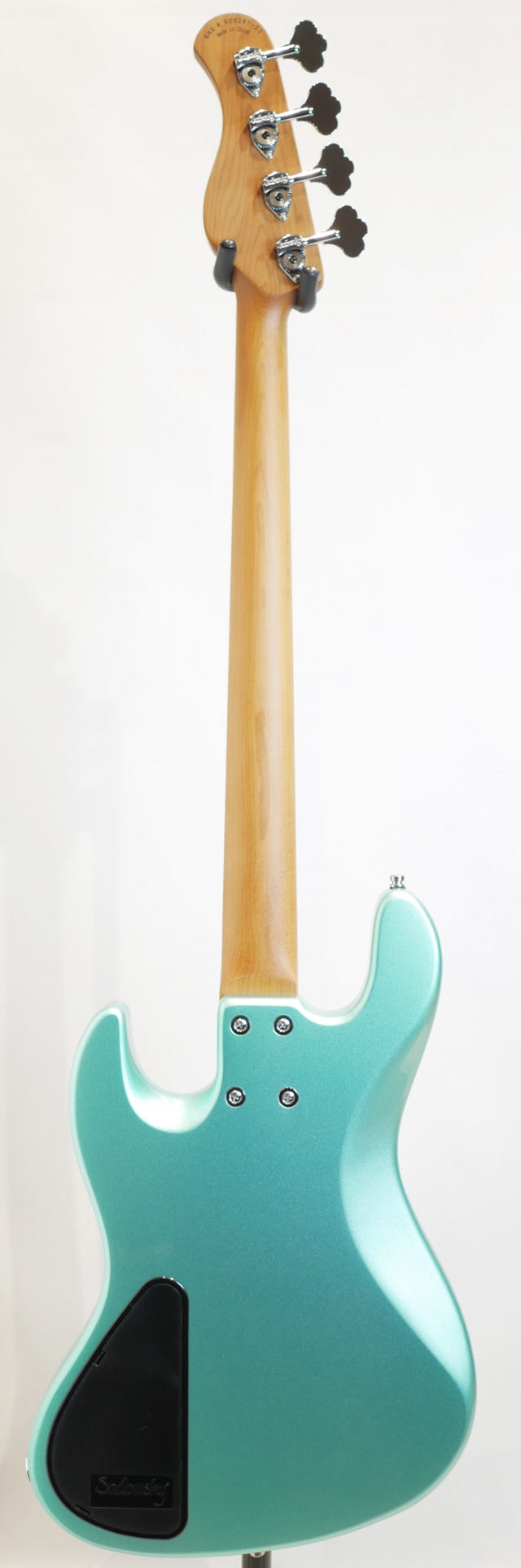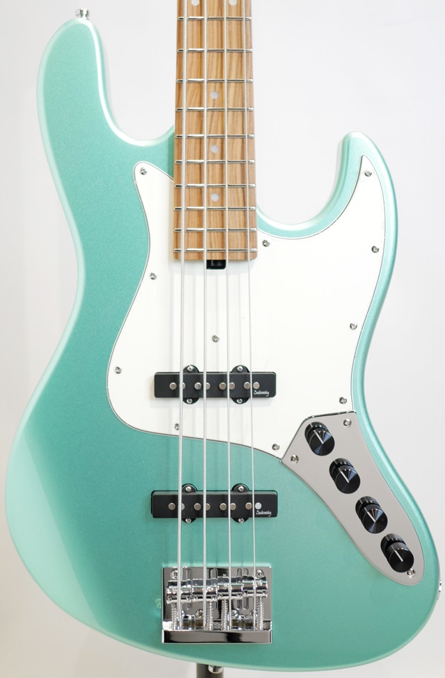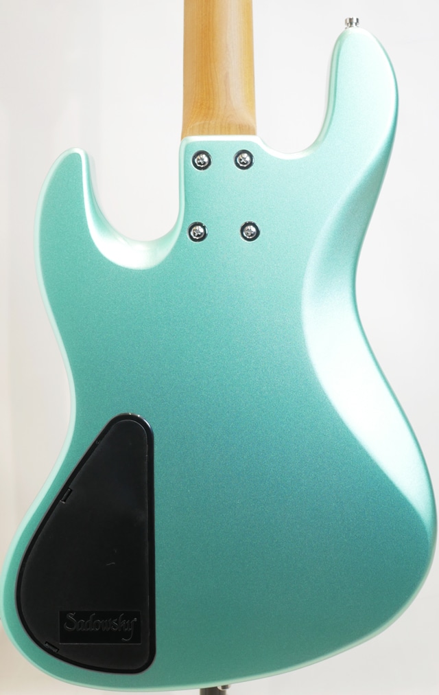 当機は、オクメボディ、ローステッドメイプルネック&モラド指板、サドウスキーではお馴染みの弦の先をブリッジエンドから通す事なくボールエンド側で弦の脱着がクイックに行えるオリジナルデザインのブリッジ、オリジナルのハムキャンセルピックアップはクリーンで明瞭なトーンとワイドレンジを持ち、2EQ仕様のオリジナルプリアンプが装備されております。 ネックはナット幅39.2mm、フラットな感触の12”の指板カーブ、ネックフィニッシュにはサテンフィニッシュが採用されスムーズな操作性を持たせてくれております。 ボディのオクメ材は西アフリカを主な原産地とするマホガニー材の特徴に似た低域のふくよかな重心の低いトーンで響きの暖かさと広がりが感じられる木材として多くのブランドでも採用されています。 ネックのローステッドメイプル材は”Sadowsky”上位機種では追加オプションとして用いられている、高温での加熱処理を施し木材の中の水分や油分を揮発させることにより剛性を高めたメイプル材となり、反りへの安定性と素早い立ち上がり(スムーズなレスポンス)、音抜けの良い響きと芯の太さが特徴として挙げらる木材です。 総合的に”Sadowsky”ブランドらしさが感じられるパワフルさとパンチのあるサウンドキャラクターを備えており、指板のモラド材が特徴も加わってか楽器の中低域がよりタイトに引き締まった鳴りと独特なエッジ感を与えてくれている印象がサウンドから感じられます。クリアなトーンの中に乾いた鳴りと表現される様なサスティーンも感じられる仕上がりとなっております。ナット幅が若干広がったものの演奏性には何ら違和感を感じる事無くご使用頂けますので、是非手に取ってそのポテンシャルをお楽しみ下さい。 Condition : NEW Body:Okoume Neck:Roasted Maple Fingerboard:Morado(Pau Ferro) Fingerboard Radius : 12” Scale Length : 864mm(34inch) Width at Nut:39.2mm(1.54inch) Bridge:Sadowsky bridge with quick string release Machineheads:Sadowsky Light machine heads with open gear Fret : 21 Nickel Silver (width: 0.094" (2.4 mm) / height: 0.051" (1.3 mm) Pickup:Passive hum-cancelling Sadowsky J-Style(Bridge P.U. 60s position) Electronics : Sadowsky Active 2-Way Controls : Volume / Balance / Treble / Bass(Push/pull function at Bass knob for preamp bypass) Case : Sadowsky Portabag (SAC BAG BASS PORTA)