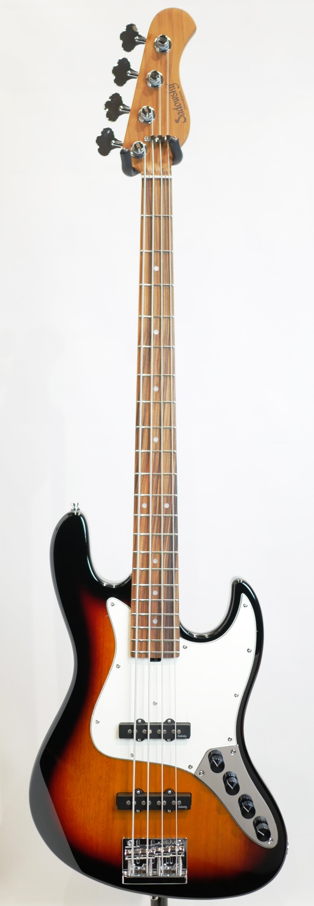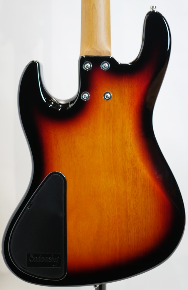 当機は、オクメボディ、ローステッドメイプルネック&モラド指板、サドウスキーではお馴染みの弦の先をブリッジエンドから通す事なくボールエンド側で弦の脱着がクイックに行えるオリジナルデザインのブリッジ、オリジナルのハムキャンセルピックアップはクリーンで明瞭なトーンとワイドレンジを持ち、2EQ仕様のオリジナルプリアンプが装備されております。 ネックはナット幅39.2mm、フラットな感触の12”の指板カーブ、ネックフィニッシュにはサテンフィニッシュが採用されスムーズな操作性を持たせてくれております。 ボディのオクメ材は西アフリカを主な原産地とするマホガニー材の特徴に似た低域のふくよかな重心の低いトーンで響きの暖かさと広がりが感じられる木材として多くのブランドでも採用されています。 ネックのローステッドメイプル材は”Sadowsky”上位機種では追加オプションとして用いられている、高温での加熱処理を施し木材の中の水分や油分を揮発させることにより剛性を高めたメイプル材となり、反りへの安定性と素早い立ち上がり(スムーズなレスポンス)、音抜けの良い響きと芯の太さが特徴として挙げらる木材です。 総合的に”Sadowsky”ブランドらしさが感じられるパワフルさとパンチのあるサウンドキャラクターを備えており、指板のモラド材が特徴も加わってか楽器の中低域がよりタイトに引き締まった鳴りと独特なエッジ感を与えてくれている印象がサウンドから感じられます。クリアなトーンの中に乾いた鳴りと表現される様なサスティーンも感じられる仕上がりとなっております。ナット幅が若干広がったものの演奏性には何ら違和感を感じる事無くご使用頂けますので、是非手に取ってそのポテンシャルをお楽しみ下さい。 Condition : NEW Body:Okoume Neck:Roasted Maple Fingerboard:Morado(Pau Ferro) Fingerboard Radius : 12” Scale Length : 864mm(34inch) Width at Nut:39.2mm(1.54inch) Bridge:Sadowsky bridge with quick string release Machineheads:Sadowsky Light machine heads with open gear Fret : 21 Nickel Silver (width: 0.094" (2.4 mm) / height: 0.051" (1.3 mm) Pickup:Passive hum-cancelling Sadowsky J-Style(Bridge P.U. 60s position) Electronics : Sadowsky Active 2-Way Controls : Volume / Balance / Treble / Bass(Push/pull function at Bass knob for preamp bypass) Case : Sadowsky Portabag (SAC BAG BASS PORTA)