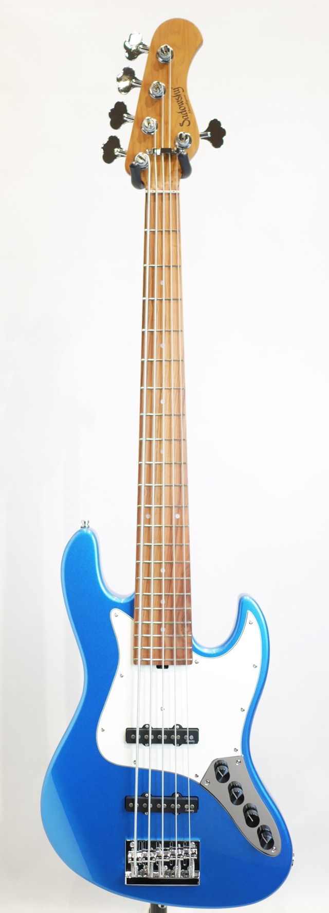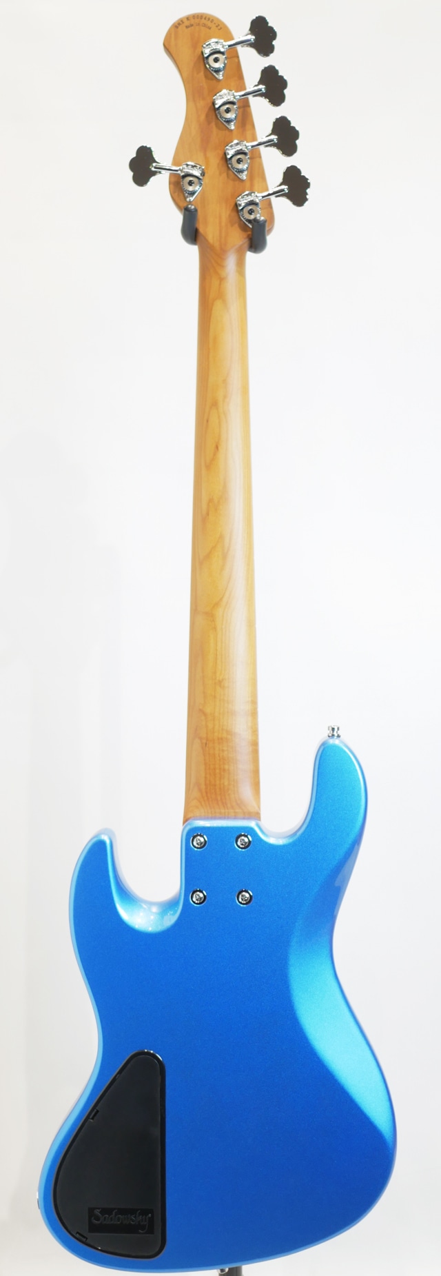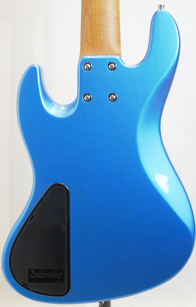 当機は、オクメボディ、ローステッドメイプルネック&モラド指板、サドウスキーではお馴染みの弦の先をブリッジエンドから通す事なくボールエンド側で弦の脱着がクイックに行えるオリジナルデザインのブリッジ、オリジナルのハムキャンセルピックアップはクリーンで明瞭なトーンとワイドレンジを持ち、2EQ仕様のオリジナルプリアンプが装備されております。 ネックはナット幅47.6mm、フラットな感触の12”の指板カーブ、ネックフィニッシュにはサテンフィニッシュが採用されスムーズな操作性を持たせてくれております。 ボディのオクメ材は西アフリカを主な原産地とするマホガニー材の特徴に似た低域のふくよかな重心の低いトーンで響きの暖かさと広がりが感じられる木材として多くのブランドでも採用されています。 ネックのローステッドメイプル材は”Sadowsky”上位機種では追加オプションとして用いられている、高温での加熱処理を施し木材の中の水分や油分を揮発させることにより剛性を高めたメイプル材となり、反りへの安定性と素早い立ち上がり(スムーズなレスポンス)、音抜けの良い響きと芯の太さが特徴として挙げらる木材です。 総合的に”Sadowsky”ブランドらしさが感じられるパワフルさとパンチのあるサウンドキャラクターを備えており、指板のモラド材が特徴も加わってか楽器の中低域がよりタイトに引き締まった鳴りと独特なエッジ感を与えてくれている印象がサウンドから感じられます。クリアなトーンの中に乾いた鳴りと表現される様なサスティーンも感じられる仕上がりとなっております。5弦の使用感も引き締まった力強い音像がアウトプットされておりますので、バランス良くご使用頂けるクオリティを持っております。是非手に取ってそのポテンシャルをお楽しみ下さい。 ※商品画像はサンプルです。商品の特性上、個体毎に木目が異なります。 Condition : NEW Body:Okoume Neck:Roasted Maple Fingerboard:Morado(Pau Ferro) Fingerboard Radius : 12” Scale Length : 864mm(34inch) Width at Nut:47.6mm(1.875inch) Bridge:Sadowsky bridge with quick string release Machineheads:Sadowsky Light machine heads with open gear Fret : 21 Nickel Silver (width: 0.094" (2.4 mm) / height: 0.051" (1.3 mm) Pickup:Passive hum-cancelling Sadowsky J-Style(Bridge P.U. 60s position) Electronics : Sadowsky Active 2-Way Controls : Volume / Balance / Treble / Bass(Push/pull function at Bass knob for preamp bypass) Case : Sadowsky Portabag (SAC BAG BASS PORTA)
