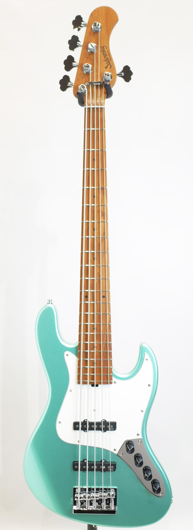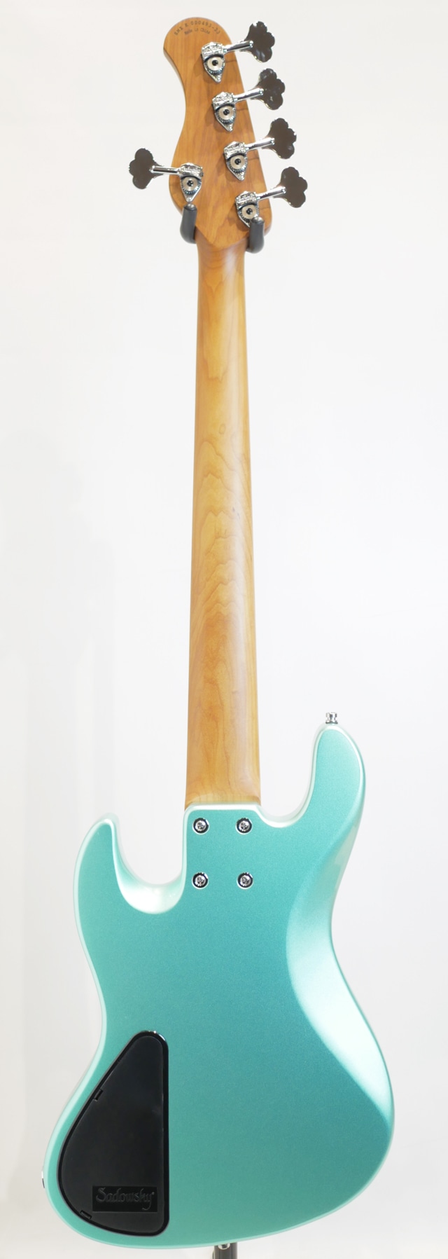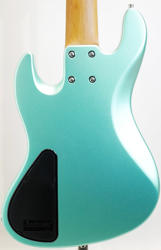 当機は、オクメボディ、ローステッドメイプルネック&指板、サドウスキーではお馴染みの弦の先をブリッジエンドから通す事なくボールエンド側で弦の脱着がクイックに行えるオリジナルデザインのブリッジ、オリジナルのハムキャンセルピックアップはクリーンで明瞭なトーンとワイドレンジを持ち、2EQ仕様のオリジナルプリアンプが装備されております。 ネックはナット幅47.6mm、フラットな感触の12”の指板カーブ、ネックフィニッシュにはサテンフィニッシュが採用されスムーズな操作性を持たせてくれております。 ボディのオクメ材は西アフリカを主な原産地とするマホガニー材の特徴に似た低域のふくよかな重心の低いトーンで響きの暖かさと広がりが感じられる木材として多くのブランドでも採用されています。 ネックのローステッドメイプル材は”Sadowsky”上位機種では追加オプションとして用いられている、高温での加熱処理を施し木材の中の水分や油分を揮発させることにより剛性を高めたメイプル材となり、反りへの安定性と素早い立ち上がり(スムーズなレスポンス)、音抜けの良い響きと芯の太さが特徴として挙げらる木材です。 総合的に”Sadowsky”ブランドらしさが感じられるパワフルさとパンチのあるサウンドキャラクターを備えており、ローステッドメイプルのネック部がピッキングのアプローチを柔軟に受け止め、程良い弾力と引き締まった中低域の鳴り、独特なエッジ感に厚みを与えてくれている印象がサウンドから感じられます。5弦の使用感も引き締まった力強い音像がアウトプットされておりますので、バランス良くご使用頂けるクオリティを持っております。是非手に取ってそのポテンシャルをお楽しみ下さい。 ※商品画像はサンプルです。商品の特性上、個体毎に木目が異なります。 Condition : NEW Body:Okoume Neck:Roasted Maple Fingerboard:Roasted Maple Fingerboard Radius : 12” Scale Length : 864mm(34inch) Width at Nut:47.6mm(1.875inch) Bridge:Sadowsky bridge with quick string release Machineheads:Sadowsky Light machine heads with open gear Fret : 21 Nickel Silver (width: 0.094" (2.4 mm) / height: 0.051" (1.3 mm) Pickup:Passive hum-cancelling Sadowsky J-Style(Bridge P.U. 60s position) Electronics : Sadowsky Active 2-Way Controls : Volume / Balance / Treble / Bass(Push/pull function at Bass knob for preamp bypass) Case : Sadowsky Portabag (SAC BAG BASS PORTA)