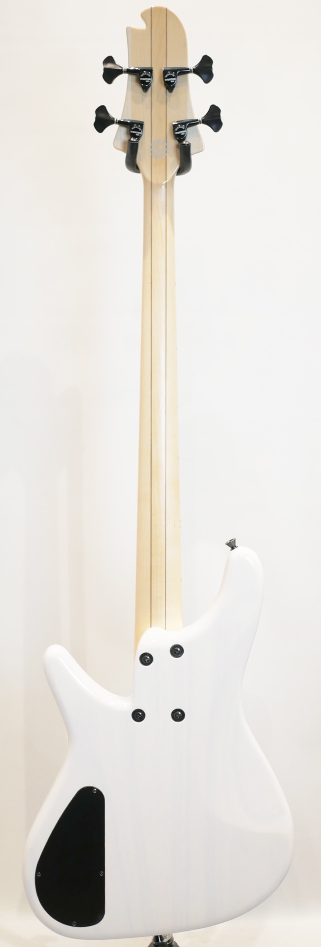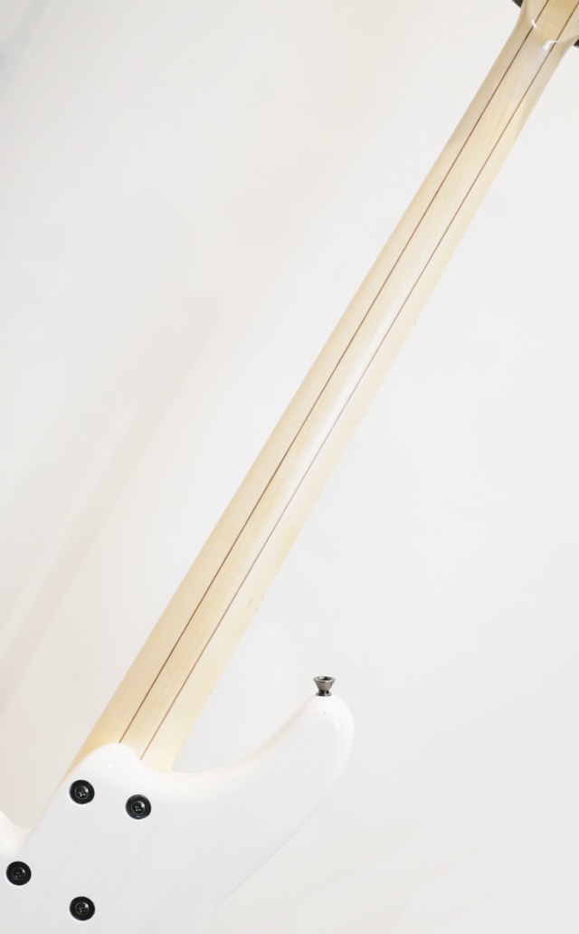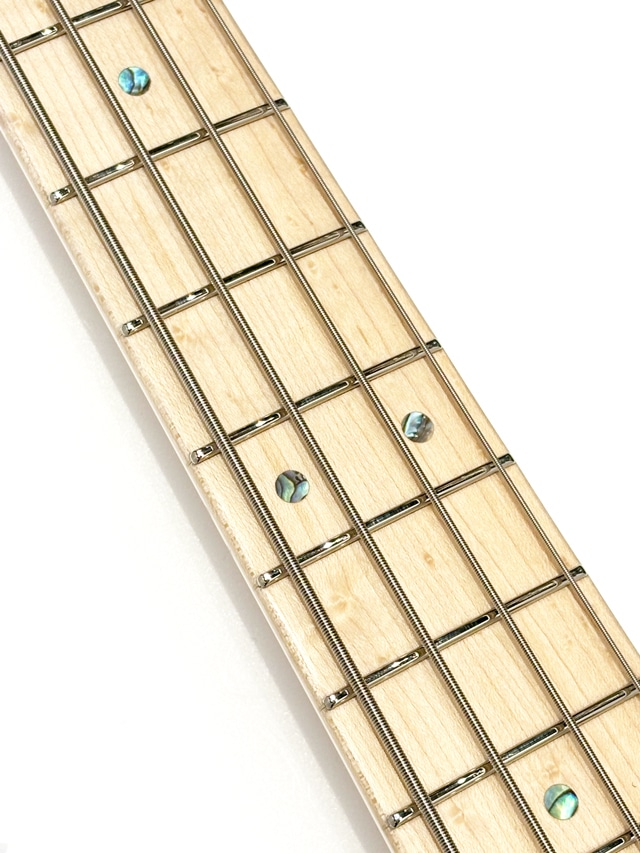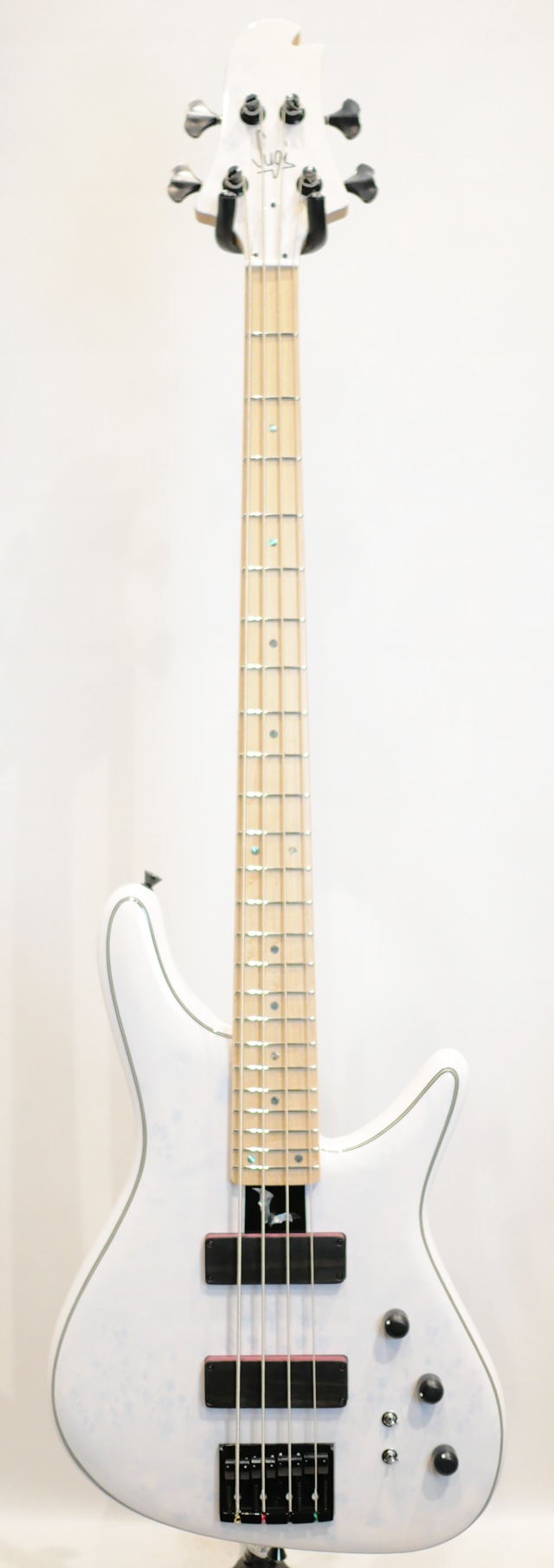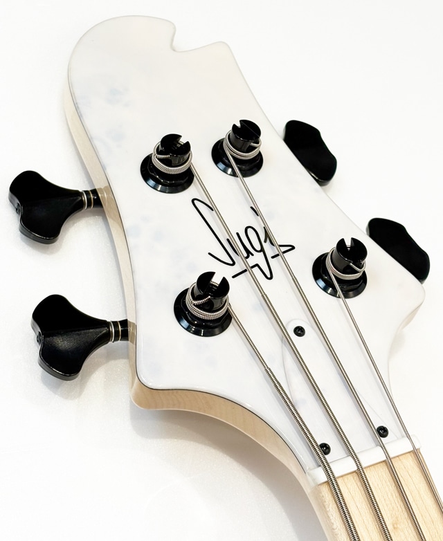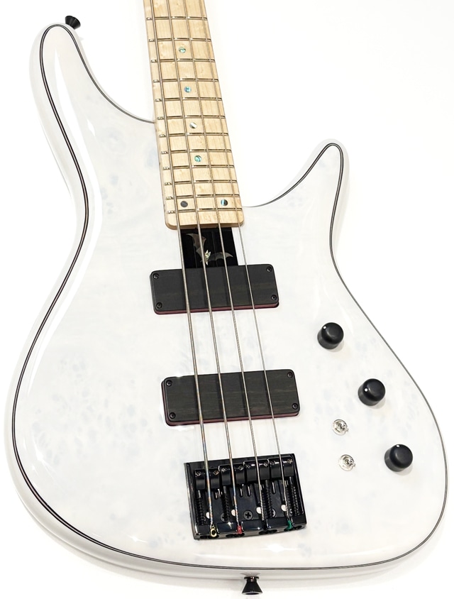 ポプラバールをトップ材にラミネートしたアッシュボディ、メイプルネック/バーズアイメイプル指板。メイプルネックはハードメイプルの3ピースラミネートとなり力強い音の押し出しを感じるアタック感が好評です。そして近年開発されたオリジナルデュアルコイルピックアップを搭載。パーツカラーはブラックで纏められております。ボディカラーのシースルーホワイトがポプラバールの瘤杢を上品に魅せております。