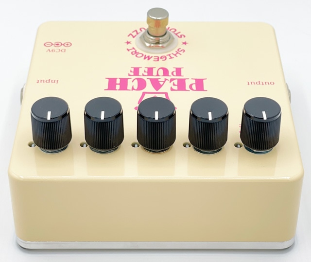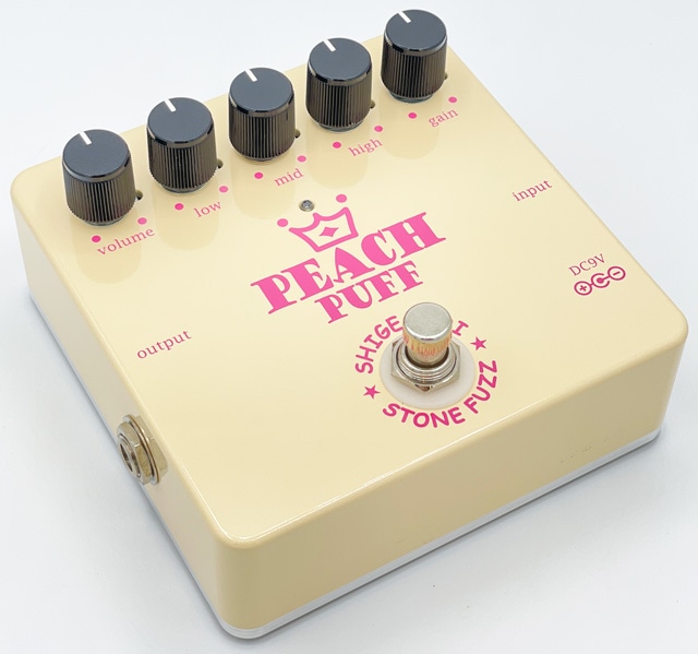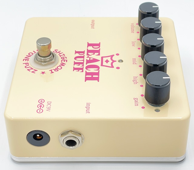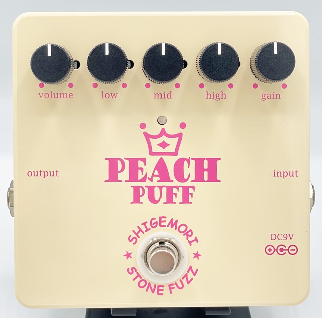 「PEACH PUFF」はVolume、Low、Mid、High、Gainで構成され、3バンドEQにてサウンドメイクが可能なベースファズです。ポピュラーな「ファズ」を想像すると別次元に連れて行ってくれる頼もしいサウンドを持った逸品です。