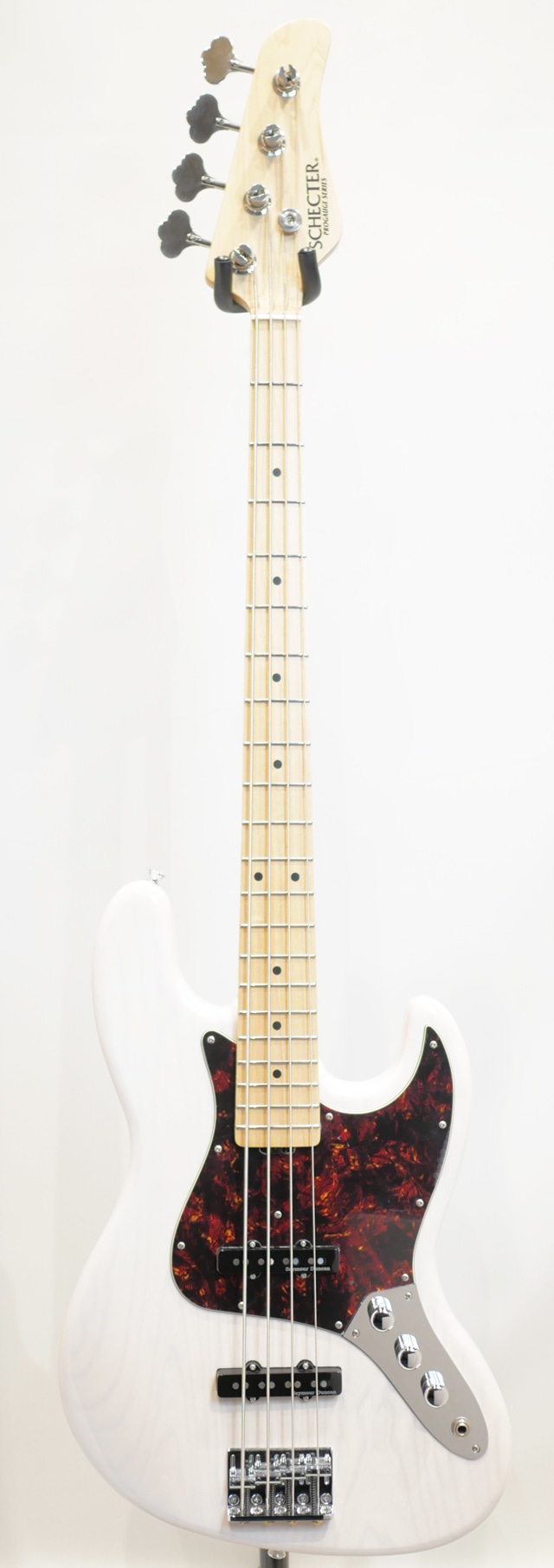 ボディはアッシュ、メイプルネック&メイプル指板、各部パーツは国産(GOTOH社)を採用し、当オーダーモデルではカラーリングにアッシュ材の杢目を活かしたシースルーホワイト、ピックアップはロックサウンドに最適なSaymour Duncan SJB-2(Hot Jazz Bass)をチョイス、同社SJB-1モデルよりもミッドレンジが強調されたトーンを特徴としており、当機ではアッシュ&メイプルの粒立ちの良いコシのあるアタック音を太く引き締まったサウンドに仕上げてくれております。