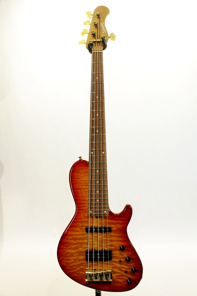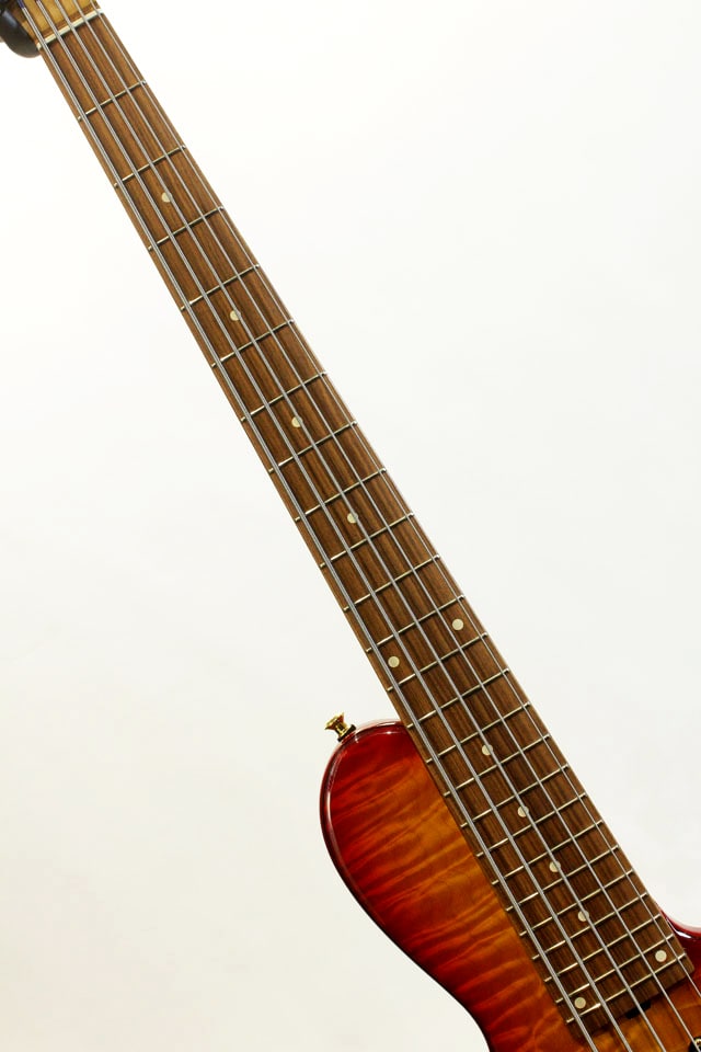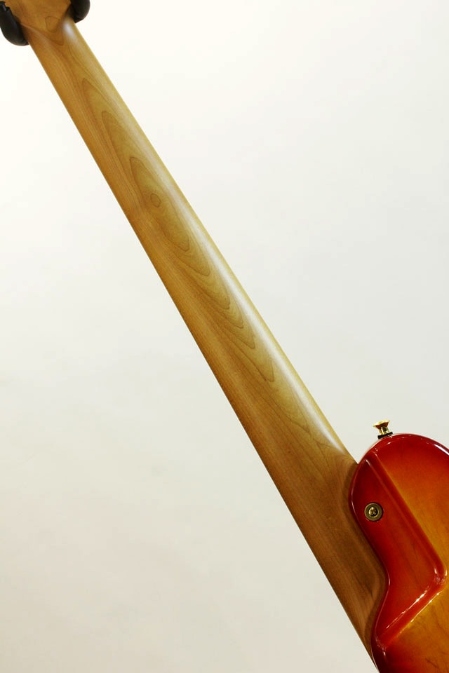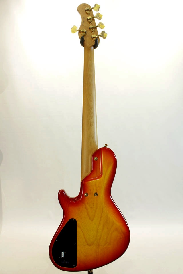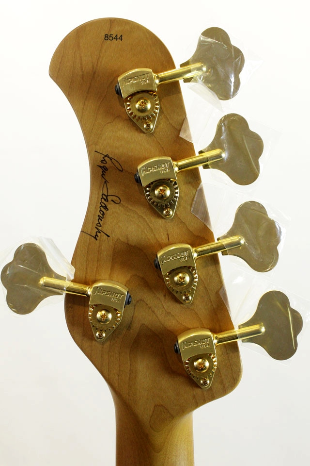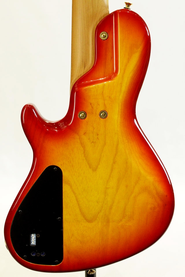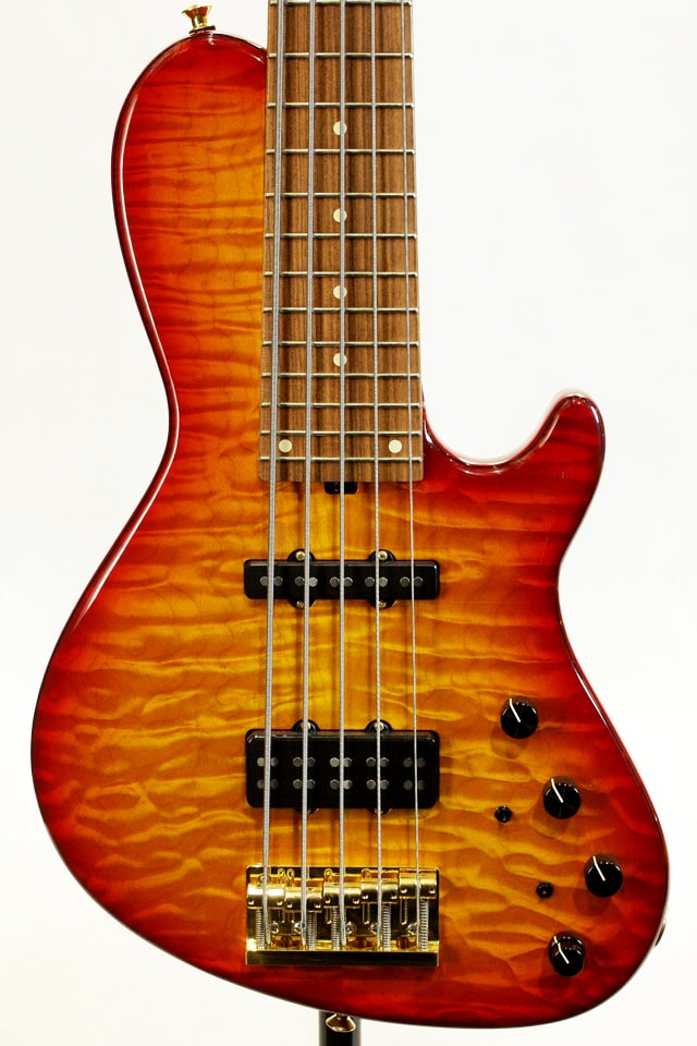 マスターグレードのキルトメイプルトップ&1pcアッシュバックのラミネイトボディ。チェンバー構造にて設計されており、総重量約3,65kgと非常に軽量です。指板はモラード、ネックはローステッドメイプルをチョイスしております。ピックアップはDual JとHumcancelingを、プリアンプはサドウスキープリアンプ+ウィルリープリアンプ(ミッドブースター)を搭載。ミッドブースターのON/OFFスイッチと、リアピックアップのフロント(タップ)/センター/リア(タップ)への切り替えスイッチ。鮮やかなフィニッシュとゴールドパーツが相まって大変美しいルックスに仕上がっております。