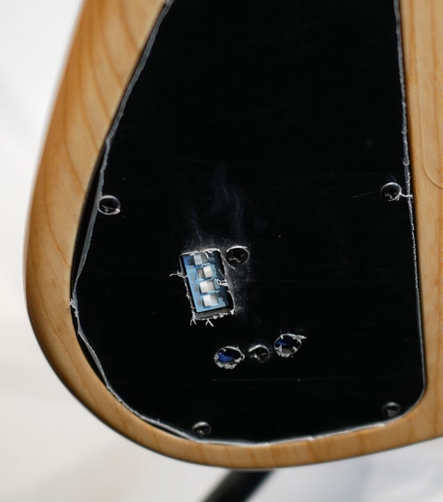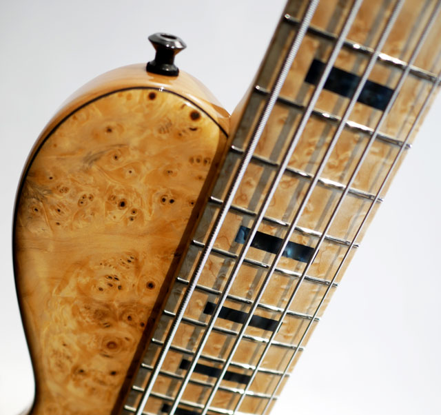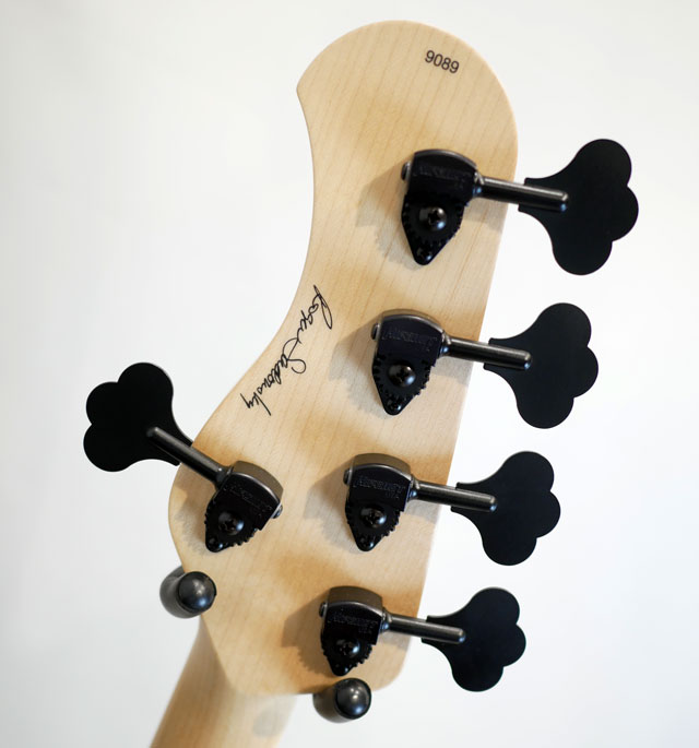 チェンバー構造のバックアイバールトップ&アッシュバックのラミネイトボディ。ボルトオン構造のメイプルネック/バーズアイメイプル指板。ブロックインレイはブラックパールにてオーダー致しました。ピックアップはSadowskyハムキャンセルJ-BASS & DCの組み合わせです。リアのDCピックアップは手元のスイッチとリンクしており、稼働コイルを3パターンから選択可能ですのでサウンドバリエーションも多彩です。プリアンプはWill Lee Preampをセレクト、ミッドブーストが搭載されております。