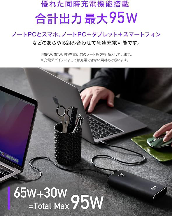 USB Type-Cを2ポートとType-Aの3ポート同時使用時、18W+65W+12W(合計95W)の高出力に対応しています。