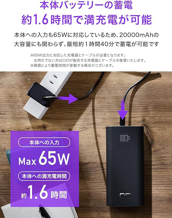20000mAhと大容量にもかかわらず、蓄電時も約1.6時間と高速で満充電が可能です。