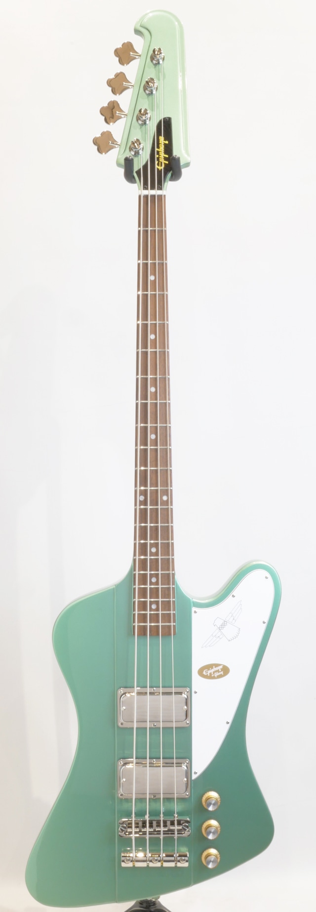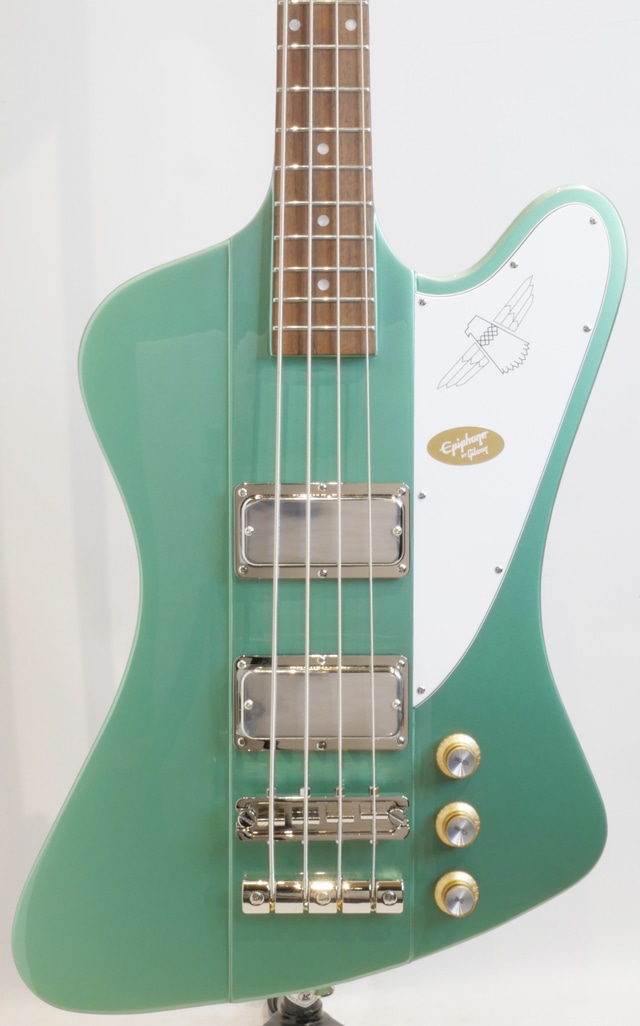 Epiphone Thunderbird '64 Inverness Greenの入荷です。 ギブソンの代名詞とも言えるサンダーバード。独特のルックスと細身のネックからは想像出来ない野太いサウンドをアウトプット致します。当時のヴィンテージ・ギブソン・サンダーバード・ベースからインスパイアされたThunderbird '64は、9層のマホガニーとウォルナットによるネック・スルー・ボディ構造からホットスタンプ刻印によるサンダーバード・ロゴを擁する3プライ・ピックガードに至るまで、オリジナルを象徴するクラシックな要素をすべて受け継いでいます。ProBucker 760 Bassハムバッカー・ピックアップとCTSポテンショメーターの組み合わせにより、深みのある豊かなトーンが実現しています。現代的なGraph Techナットや、19:1のギア比を持つクローバー・ボタン・チューナーなど機能性も十分です。 Shape:Thunderbird Material:9-plyMahogany/WalnutNeck-Through Side:MahoganyWings Neck:9-plyMahogany/Walnut Profile:60sRoundedBass Nutwidth:38mm Fingerboard:IndianLaurel Scalelength:863.6mm Numberoffrets:20 Nut:GraphTech Inlay:PearloidDot Bridge:EpiphoneVintageBassTune-O-Matic Tailpiece:EpiphoneVintageBassClaw Tuners:Open-gearBassTunerswithHistoricCloverButtonsand19:1GearRatio Pickups:ProBucker760BassHumbucker Controls:2Volume,MasterTone;500KCTSPotentiometers