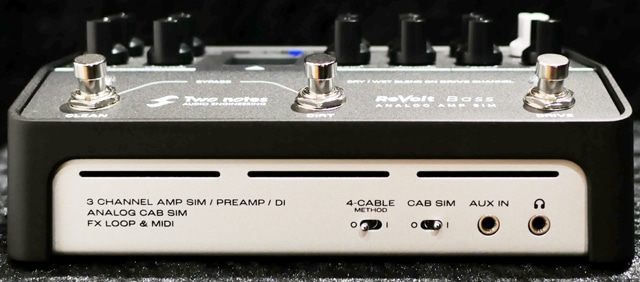 また、「CLEAN」と「DIRT」のフットスイッチを同時押しすることでバイパスモードにも対応しており主流のデジタルアンプとの組み合わせに対しての細かなチェックにも役立ち、「ヘッドフォンアウト」「AUX IN」も備えておりますので本機をヘッドフォンアンプの様に音源をチェックしながらのサウンドセットアップや個人練習、DTMへの接続前の詳細なサウンドメイクなどアンプシュミレーター枠に留まらない活躍をしてくれる頼もしいアイテムです。