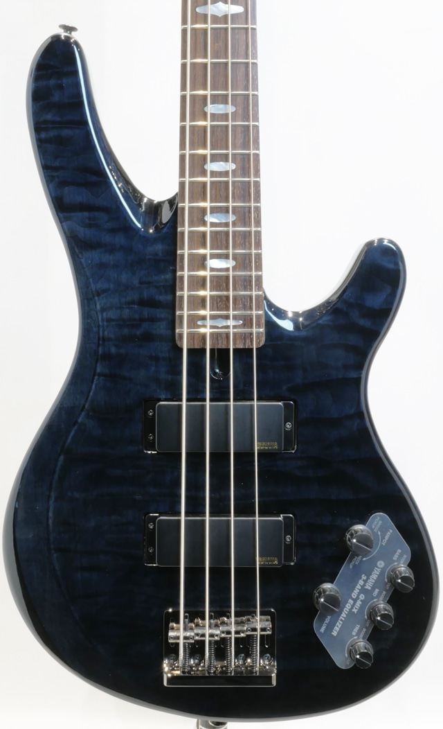 迫力ある低音域と適切なテンション感を確保するために設計された35インチ(889mm)のスーパーロングスケールを採用し、長年の研究に基づいたボディ・ネック構造と先端のピックアップ&サーキットとが生み出す、明確な音像と迫力あふれる重低音を特徴とするTRBシリーズ。4弦ベースのサウンドレンジを越えた重低音のクオリティが、ミュージシャンマインドを強く刺激します。 中音域のアウトプットを得意とするアルダーとタイトな低音を生み出すメイプルを組み合わせ、更にトップにはフィギアド・メイプルを使用しています。トップ面のアームコンターは大胆にカットされ、ネックのハイポジションへのアクセスが容易になるようホーンカットも施されています。 反りやネジれに強い5ピースネック構造やピックアップはクリアな音像を追及したハムキャンセルタイプに高い伝導効率で弦振動をボディに伝える新開発ブラスブリッジとよりサウンドに追求された仕様になっております。 Body :メイプル+アルダー Fretboard : ローズウッド / 250R Neck : メイプル+ナトー5pcs Nut wide:40mm Fret:24 Bridge : ソリッドブラス /19mm Scale:35”(889mm) Case : オリジナルギグケース