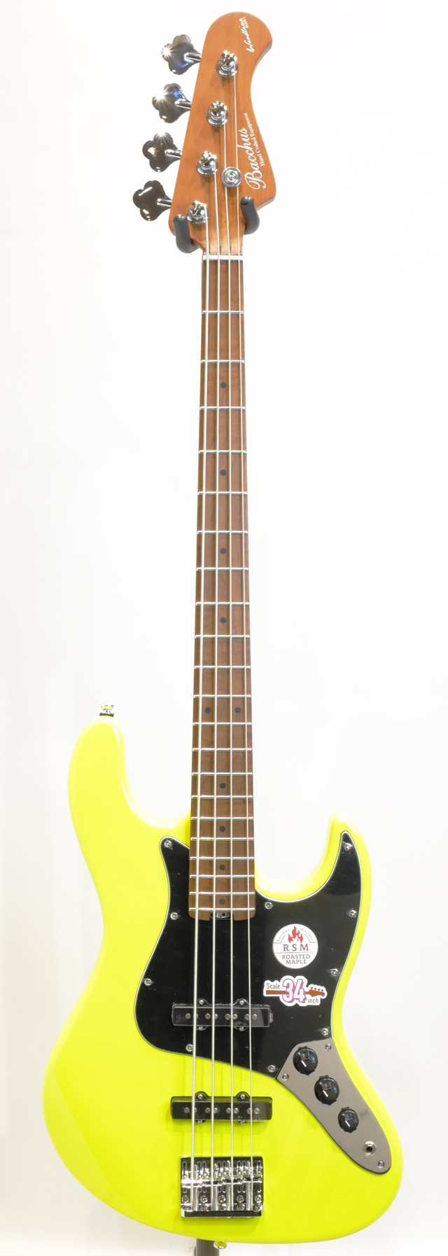 Bacchus Global Series Handmadeシリーズの仕様を海外工場にて生産する事でハイコストパフォーマンスを実現しているBacchusの定番ライン。そのお求めやすい価格帯と確かなクオリティで人気の高いシリーズです。 本国、飛鳥ファクトリーにて製作される最上位機種”WOODLINE”を基に海外生産されている”WL4-STD”モデル。 当機最大の特徴は一目見て分かる色濃いネック材。そのネック&指板には、高温で加熱処理して材の中の水分や油分を一定数量に揮発させることにより剛性を高め、豊かな生鳴りと経年変化したビンテージのような小慣れたトーンを生み出す、高級機種で採用される事の多いローステッドメイプル材が使用されております。ボディは一般的なJBモデルよりも少しスマートなサイズとなるディンキーシェイプが採用されており取り回しの良いサイズが実現しております。 また、上位機種”WOODLINE”シリーズ定番”ターボスイッチ”も搭載され、トーンノブをプルアップすると2つのシングルピックアップをシリーズ(直列)接続し、従来とは一味違う太く力強いハムバッキング・ピックアップのようなサウンドを作り出します。 小振りなベースながらもネック材の特徴もあり力強い低音を持ち幅広いシチュエーションに対応可能なポテンシャルを持っておりますので、これからベースを始めようと思っていた方や、取り回しが良くて使いやすい2本目をお探しだった方におススメのベースです。 Body : Nyatoh Neck : Roasted Maple Fingerboard : Roasted Maple Nut : Graphtech TUSQ XL Bridge : JB bridge w/ brass saddle Machineheads : Open Gear Type Pickup : Original JB set Control : 2Vol,1Tone(Pull up=Turbo SW) Scale : 864mm(34inch) Fingerboard Radius : 310R Width at Nut : 38.0mm Case:オリジナルソフトケース