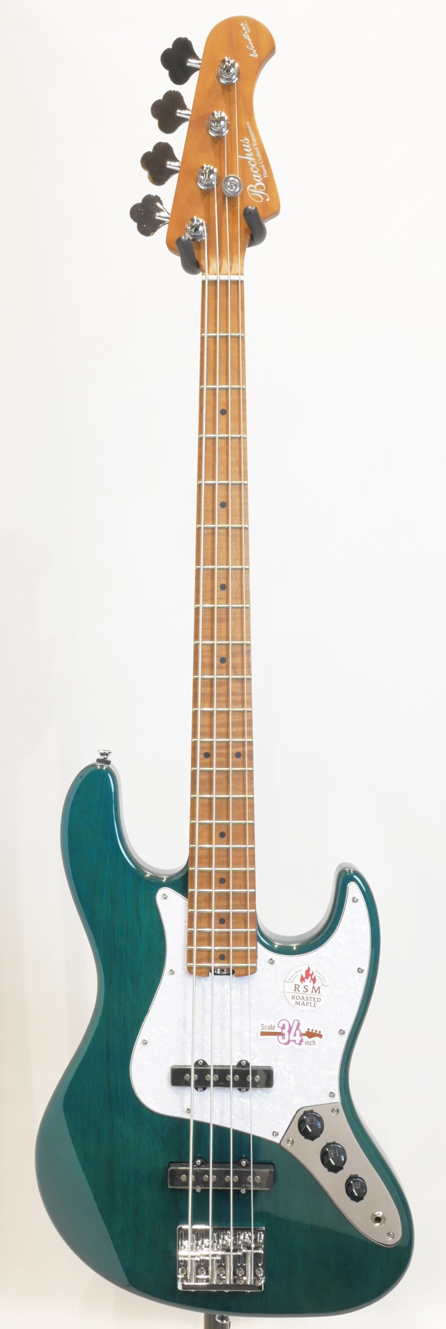 Bacchus Global Series Handmadeシリーズの仕様を海外工場にて生産する事でハイコストパフォーマンスを実現しているBacchusの定番ライン。そのお求めやすい価格帯と確かなクオリティで人気の高いシリーズです。 本国、飛鳥ファクトリーにて製作される最上位機種”WOODLINE”を基に海外生産されている”WL4-STD”モデル。 当機最大の特徴は一目見て分かる色濃いネック材。そのネック&指板には、高温で加熱処理して材の中の水分や油分を一定数量に揮発させることにより剛性を高め、豊かな生鳴りと経年変化したビンテージのような小慣れたトーンを生み出す、高級機種で採用される事の多いローステッドメイプル材が使用されております。ボディは一般的なJBモデルよりも少しスマートなサイズとなるディンキーシェイプが採用されており取り回しの良いサイズが実現しております。 また、上位機種”WOODLINE”シリーズ定番”ターボスイッチ”も搭載され、トーンノブをプルアップすると2つのシングルピックアップをシリーズ(直列)接続し、従来とは一味違う太く力強いハムバッキング・ピックアップのようなサウンドを作り出します。 小振りなベースながらもネック材の特徴もあり力強い低音を持ち幅広いシチュエーションに対応可能なポテンシャルを持っておりますので、これからベースを始めようと思っていた方や、取り回しが良くて使いやすい2本目をお探しだった方におススメのベースです。 ※掲載画像はサンプルです。商品の特性上、個体毎に木目や色合いが異なります。 ※外観部の仕上げ不良、金属パーツの傷やくすみは保証対象外になります。 Body : Nyatoh Neck : Roasted Maple Fingerboard : Roasted Maple Nut : Graphtech TUSQ XL Bridge : JB bridge w/ brass saddle Machineheads : Open Gear Type Pickup : Original JB set Control : 2Vol,1Tone(Pull up=Turbo SW) Scale : 864mm(34inch) Fingerboard Radius : 310R Width at Nut : 38.0mm Case:オリジナルソフトケース