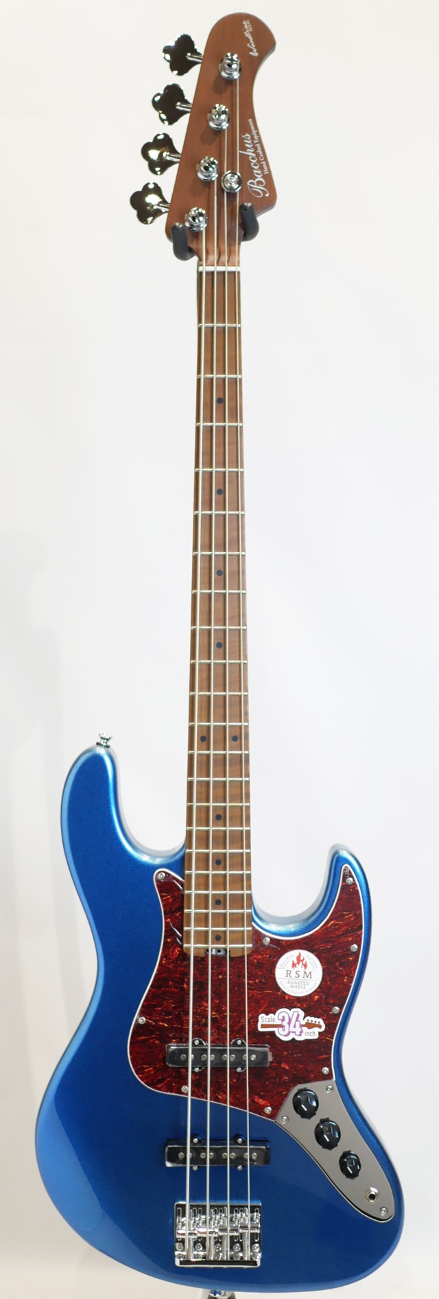 Bacchus Global Series Handmadeシリーズの仕様を海外工場にて生産する事でハイコストパフォーマンスを実現しているBacchusの定番ライン。そのお求めやすい価格帯と確かなクオリティで人気の高いシリーズです。 本国、飛鳥ファクトリーにて製作される最上位機種”WOODLINE”を基に海外生産されている”WL4-STD”モデル。 当機最大の特徴は一目見て分かる色濃いネック材。そのネック&指板には、高温で加熱処理して材の中の水分や油分を一定数量に揮発させることにより剛性を高め、豊かな生鳴りと経年変化したビンテージのような小慣れたトーンを生み出す、高級機種で採用される事の多いローステッドメイプル材が使用されております。ボディは一般的なJBモデルよりも少しスマートなサイズとなるディンキーシェイプが採用されており取り回しの良いサイズが実現しております。 また、上位機種”WOODLINE”シリーズ定番”ターボスイッチ”も搭載され、トーンノブをプルアップすると2つのシングルピックアップをシリーズ(直列)接続し、従来とは一味違う太く力強いハムバッキング・ピックアップのようなサウンドを作り出します。 小振りなベースながらもネック材の特徴もあり力強い低音を持ち幅広いシチュエーションに対応可能なポテンシャルを持っておりますので、これからベースを始めようと思っていた方や、取り回しが良くて使いやすい2本目をお探しだった方におススメのベースです。 ※掲載画像はサンプルです。商品の特性上、個体毎に木目や色合いが異なります。 ※外観部の仕上げ不良、金属パーツの傷やくすみは保証対象外になります。 Body : Nyatoh Neck : Roasted Maple Fingerboard : Roasted Maple Nut : Graphtech TUSQ XL Bridge : JB bridge w/ brass saddle Machineheads : Open Gear Type Pickup : Original JB set Control : 2Vol,1Tone(Pull up=Turbo SW) Scale : 864mm(34inch) Fingerboard Radius : 310R Width at Nut : 38.0mm Case:オリジナルソフトケース