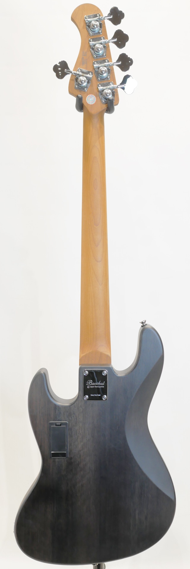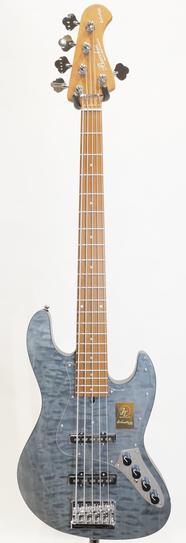 “Japan Tune-up series” ”JTシリーズ”の製品では全てプレイヤーがすぐに実践使用を開始できることをイメージし、長野県松本市にあるディバイザー専門部署「WDG(Workshop Deviser Guitars)」にてプレイアビリティに直結する部分を経験豊富な日本の職人の手によって弾きやすさに直結する弦高調整や指板の最終仕上げなどもチューンナップの項目として、フレットすり合わせ、ナット加工&サドル調整、フレットエッジ加工に至るまで1台1台手間暇を惜しまず調整とセットアップを行っています。 2001年から始まったBacchus最高級ラインの”Handmade Series”のスピリットを受けつぎ、「プレイヤーの皆様が安心してその身を預け、最高のパフォーマンスを生み出す楽器」を送り出すシリーズです。 “WL”モデルは、”Handmade Series”で培った“WOODLINE”の持つディンキーシェイプのボディを継承し、一般的なJBタイプのエレキベースよりややスリムに設計されプレイアビリティに優れます。ボディトップには美しい杢目が目を引くキルトメイプル材を採用、ボディバックにはマホガニー材と似た特徴を持つ中低域が豊かなナトー材、ボディ外周にはブラックのバインディングが施され引き締まったルックスと、つや消しタイプのマットな仕上げにより上品で落ち着いた印象を持った高級感のある仕上がりです。ネック&指板には、高温で加熱処理して材の中の水分や油分を一定数量に揮発させることにより剛性を高め、豊かな生鳴りと経年変化したビンテージのような小慣れたトーンを生み出す、高級機種で採用される事の多いローステッドメイプル材が使用されております。 また、各部の上質な仕上げに加えパーツや機能にも拘りは受け継がれており、従来品よりも比重が高く密度の詰まった中低音域にかけて広がるベース・トーンが特徴の真鍮(ブラス)製のオリジナルネックプレートを採用。さらに”WL5”モデルでは”Handmade Series”のアクティブモデルと同様に2バンドEQを備え、演奏中の細かなサウンドメイキングをサポートします。ミニスイッチの切り替えにより、パッシブタイプとしてもご使用頂けます。アクティブ時とパッシブ時でのサウンドキャラクター、音量差は限りなく差異が感じられず大変扱い仕様になっているのも嬉しいポイントです! ”JTシリーズ”は実際に手に取ってみてその丁寧な仕上げには息を呑みます。高い演奏性能に劣らないバランス良くアウトプットされるサウンドにも驚きです。中低域の力強さにクリアなトーンキャラクターを持ち、楽器そのもののポテンシャルでLow-Bが明瞭にバランス良く鳴りますのでアクティブサーキットに頼らずとも鳴る、純国産モデルと言っても差し支えない程のハイポテンシャルを持った仕上がりとなっております。 Body Top : Quilted Maple Body : Nyatoh Neck : Roasted Maple Fingerboard : Roasted Maple Nut : PPS Bridge : JB bridge w/ brass saddle Machineheads : Opengear Type Pickup : Original JB set Preamp : BBP2 Control : 1Vol, 1Bal, Treble, Bass, Preamp On / Off Switch Scale : 864mm(34inch) Fingerboard Radius : 400R Width at Nut : 45.0mm Case:オリジナルソフトケース