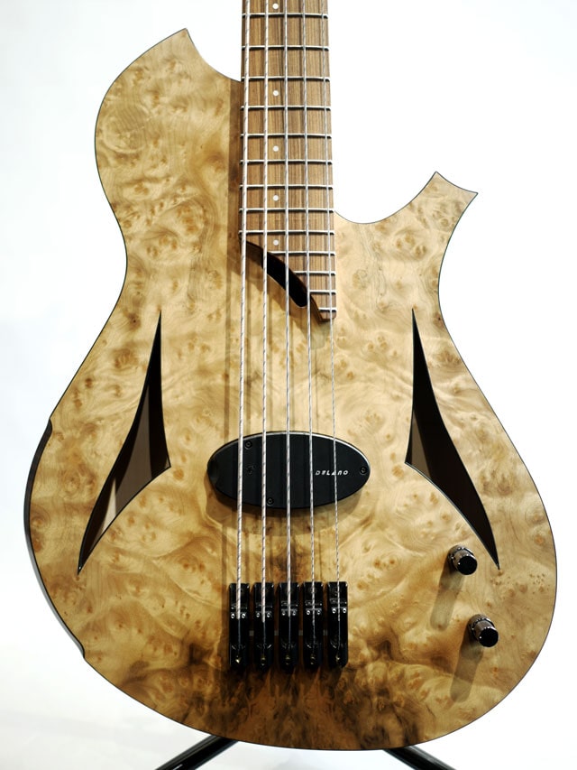 フランス南東部に位置するプロバンス地方アヴィニョンにワークショプを構えるルシアー Paul Lairat。キャビネットメーカーで働いていた時代のノウハウも含め、木材の入手先、材質の選定に拘り、徹底的にトーンウッドを集め、楽器製作をスタート。こちらは、5種類の木材で構成された独創的なフルアーコースティックスタイルのボディと、Wengeを中心とした4種類類の木材で構成されたネックを持つGABRIELLA(ガブリエラ)。ボディ厚はセミアコよりも少し厚みがあるフラットトップ、フラットバック構造で、ボディトップとバックに厚みを持たせておりますので、響き生み出す太さがソリッドなトーンを豊かにするような音色が特徴的で。