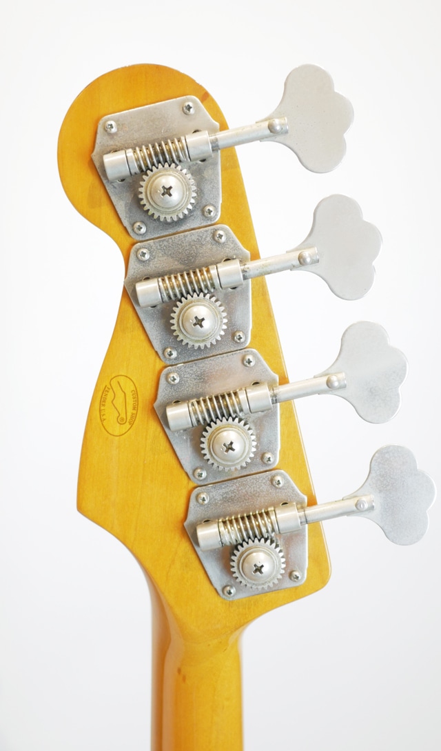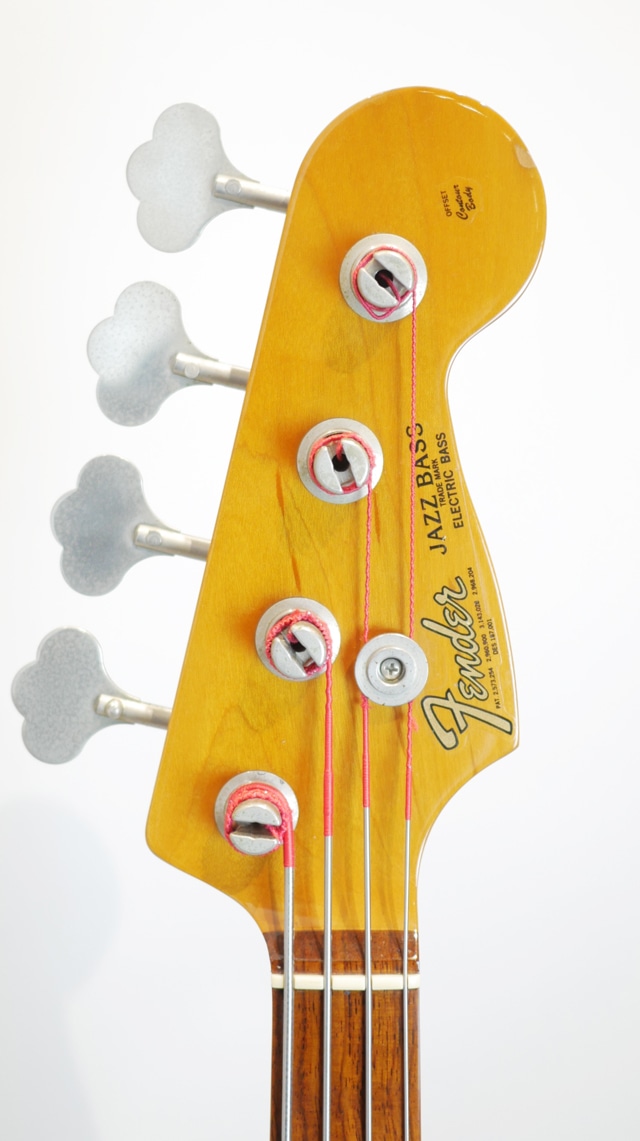 アルダーボディにスラブ貼りのローズウッド指板、メイプルネックと60年代初期スペックを採用。ブリッジやチューニングキーなどのハードウェア類は交換された形跡もなく、オリジナルが搭載されています。仕様だけ見るとJacoモデルにも見受けられますが、付属の認定書には「62 Jazz Bass」という記載のみとなっており、シグネイチャーモデル扱いではございません。ピックガードやフェンス類のマウントホールも空いておらず、取り付けをご希望の場合別途加工が必要となりますのでご注意ください。