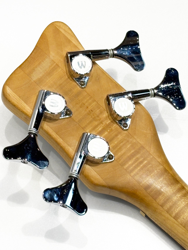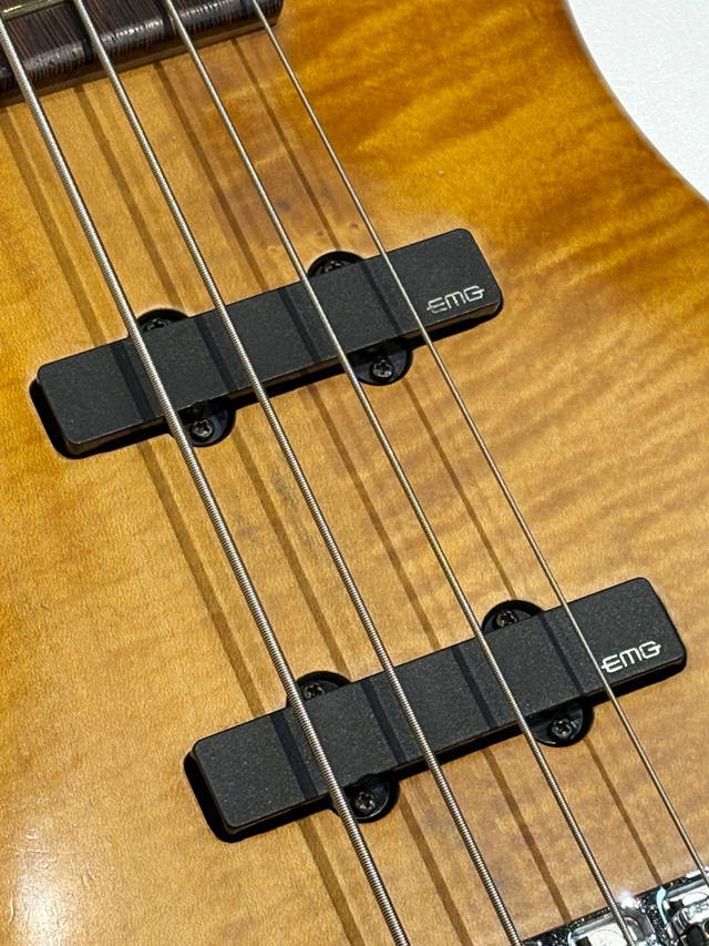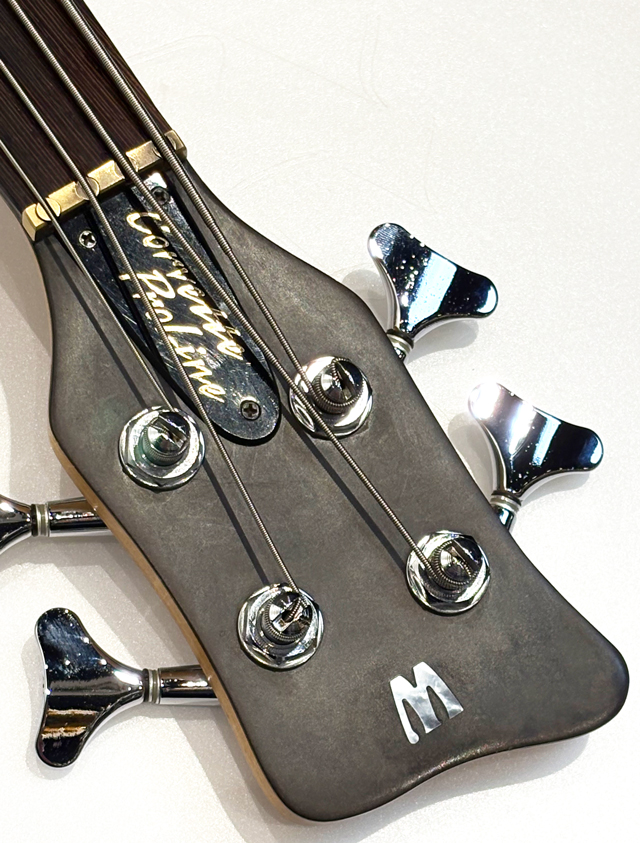 その人間工学に基づく個性的なフォルムと、2ハムバッカー仕様”$$”モデルのインパクトあるルックスでお馴染みの”Corvette”モデル。当機はその”初期型となる”Pro Line”モデルになります。Warwick社の年表によれば1992年の誕生、のちの”Corvette Standard”に繋がって行く最初期の個体でございます。ボディは杢の入ったメイプルになりますのでフィギュアードメイプルとしております。ネックはボルトオン仕様のフレイム杢の入ったメイプル3ピースネック、指板はウェンジとなっております。ボディカラーは、30年以上が経過しており色焼けしたナチュラルまたはアンバーカラーとなります。ピックアップ、プリアンプはオリジナル”MEC”が当時の標準仕様の様ですが、当機は”EMG”に換装されており、”SJ”ピックアップと”BTC”プリアンプのコンビネーションとなります。ピックアップが2023年製と確認できておりますので近年交換が行われており、Warwick社のオーダーオプションにもある楽器にマッチしたチョイスとなっております。ストラップ品はフラッシュマウント方式(ストラップ側アタッチメント付属)、その他パーツ類はオリジナル品が用いられております。