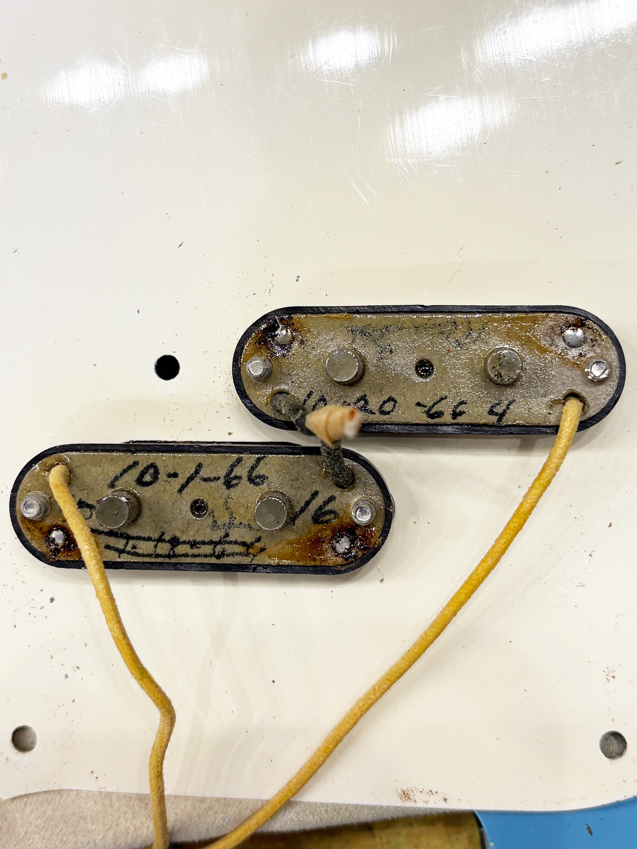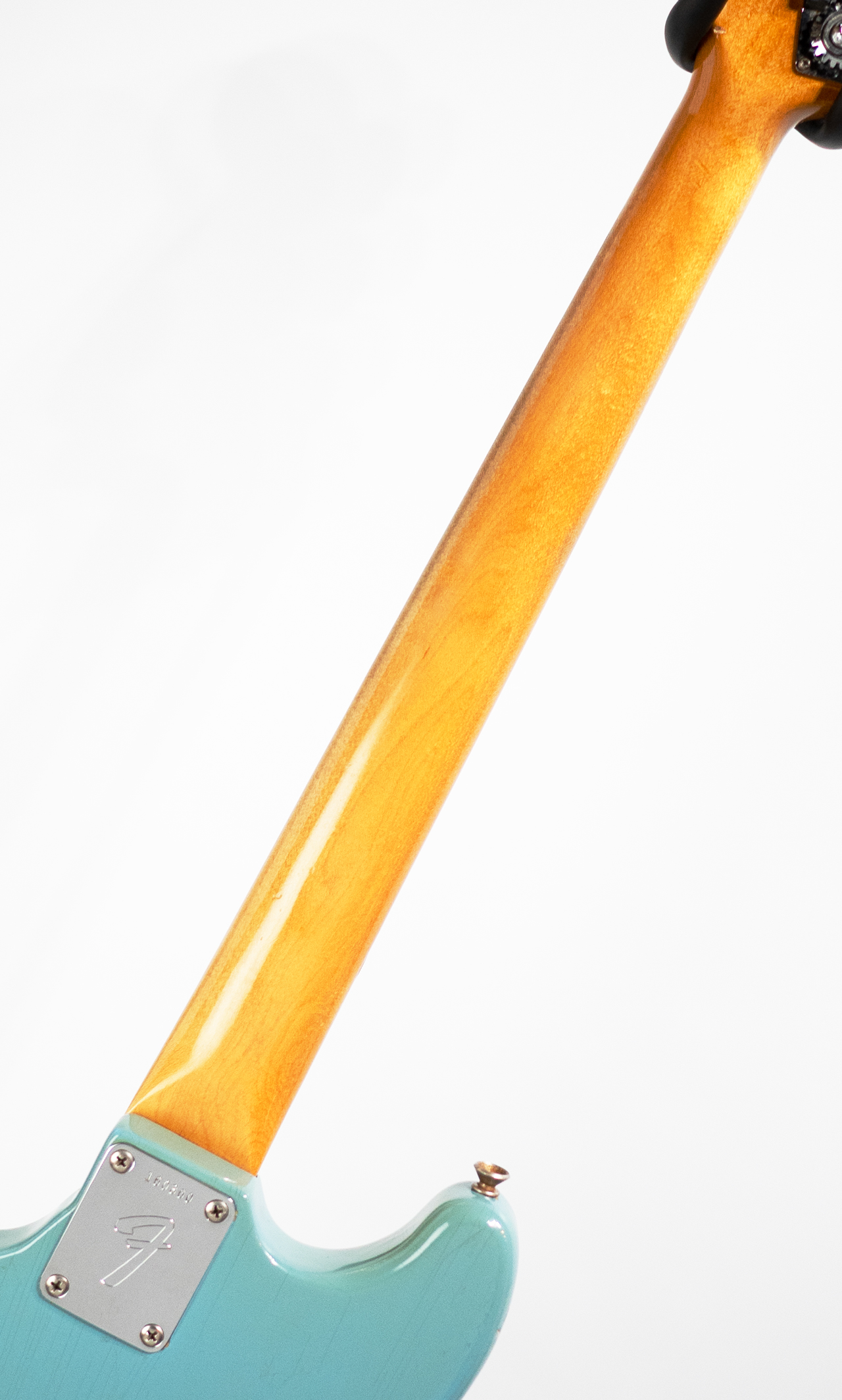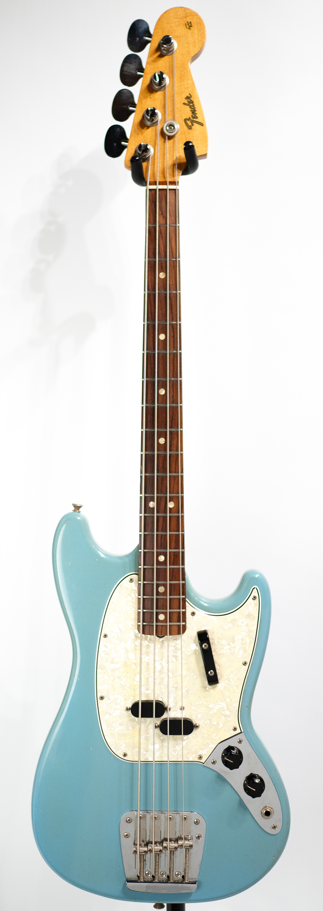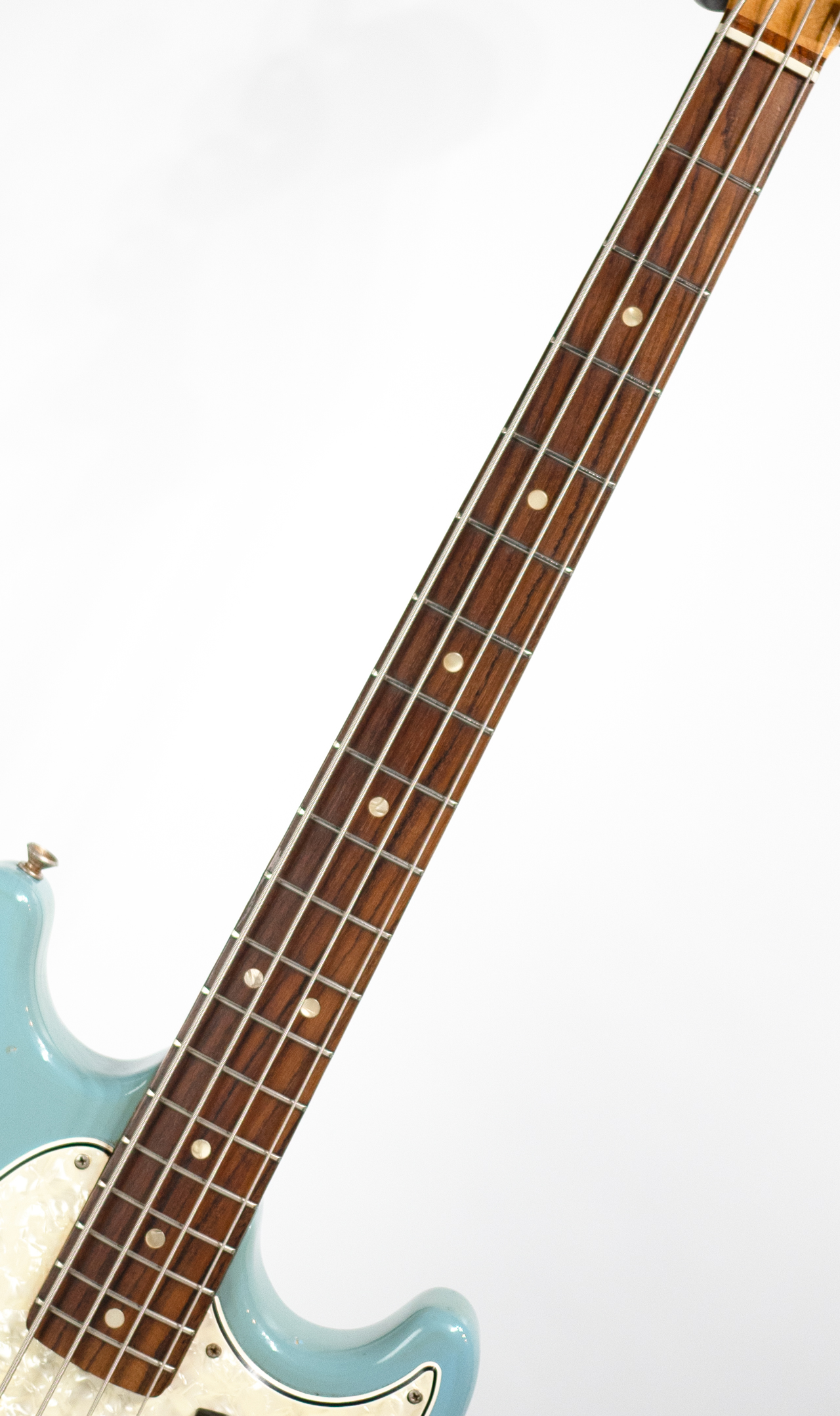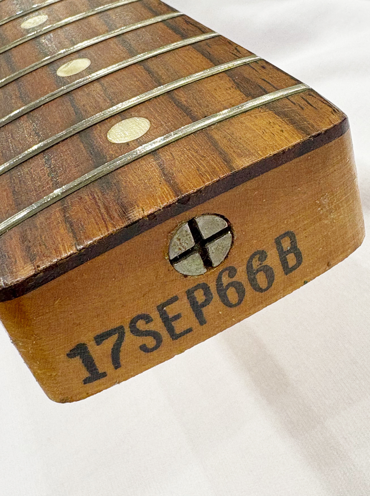 1966年から製造が始まったとされる”Mustang Bass”。本機はヘッドデカールが”Fender”ロゴのみと製造最初期に見られる希少な1本です。ミュートゴムの欠品を除いて交換パーツも見受けられず、ネックデイト、ポットデイト、ピックアップデイトで66年を記してあり、大変オリジナル性が高い個体です。