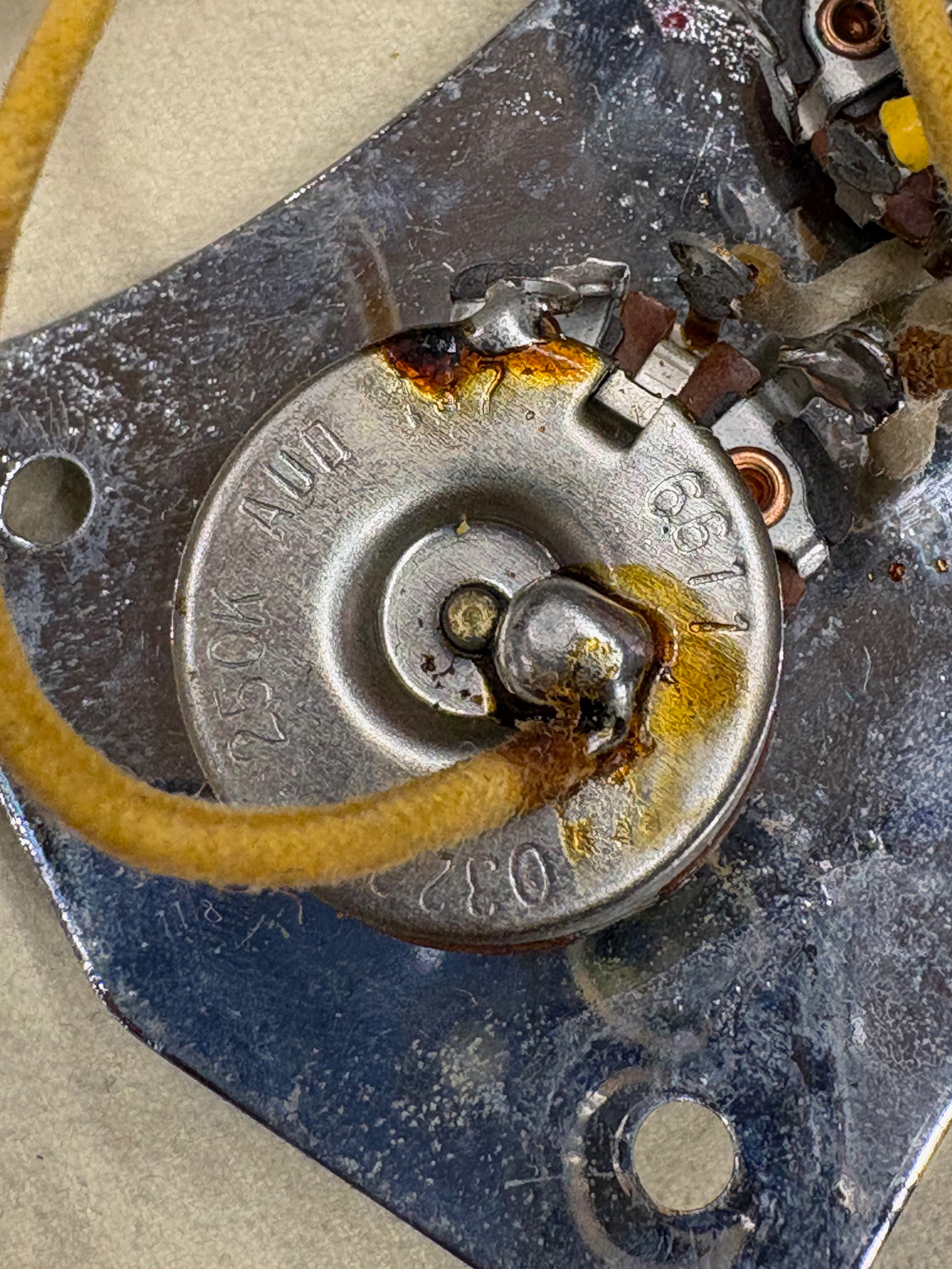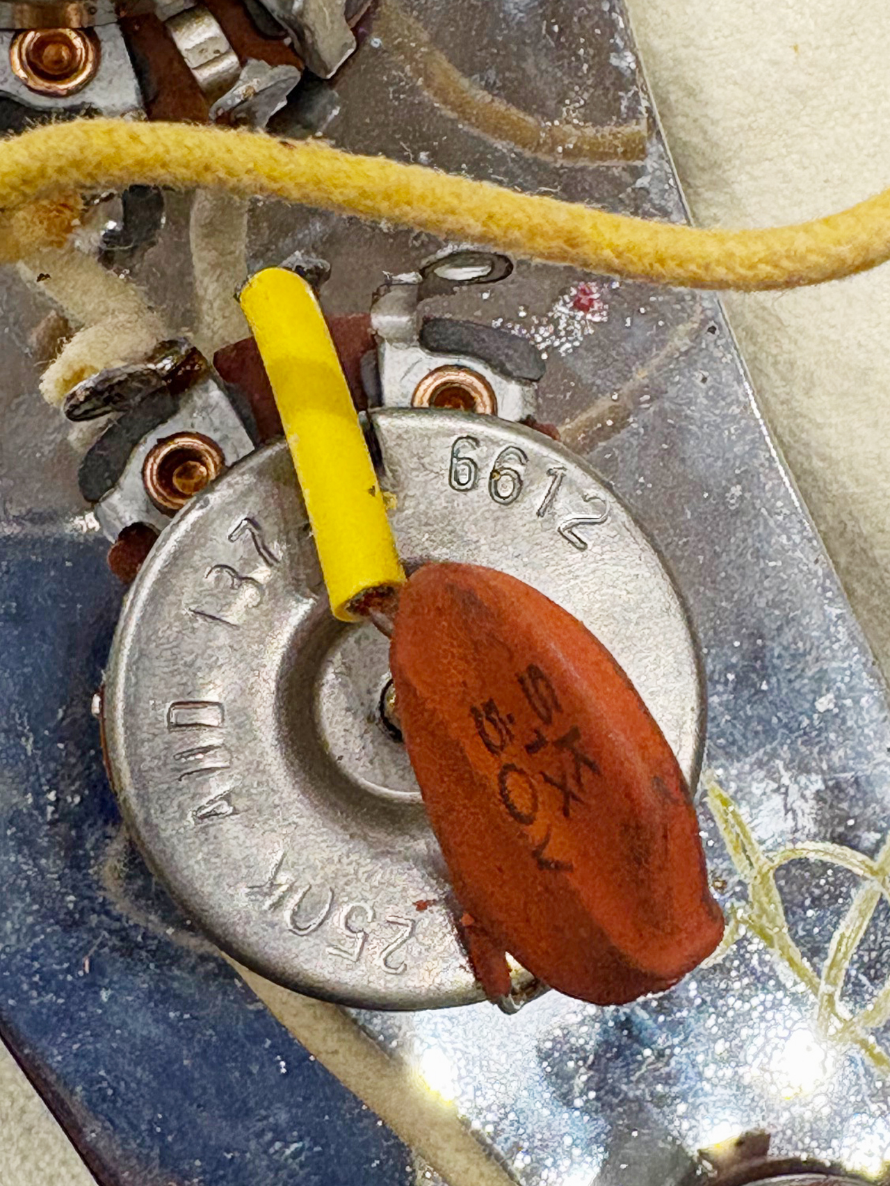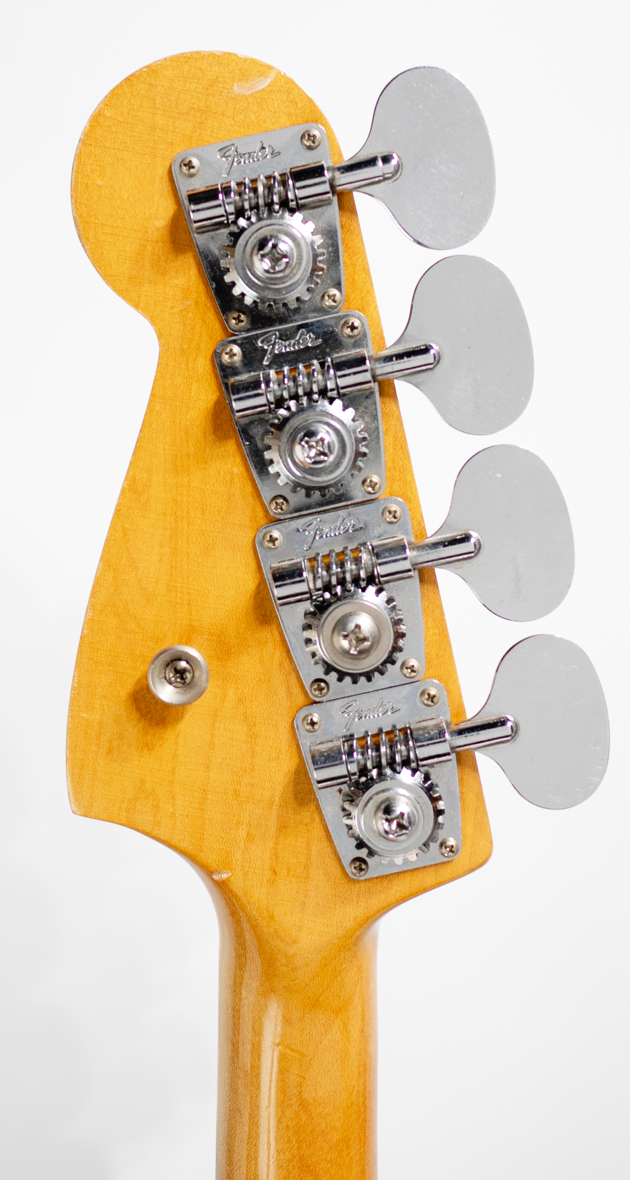 ボディは全体的に傷や打痕が散見、エンドピンと裏通し穴の中間値に黒い塗料系の汚れが見られます。ネックはヘッド側面の塗装にケース跡の様な白い部分が2箇所ほど見られます。また、ヘッドで吊り下げを行っていたのかスタンド焼け若干見られます。ボディ、ネックともに退色やウェザーチェックが広がっておりますが比較的塗装引けは顕著ではなくしっかりと塗装の厚みも残っている印象です。