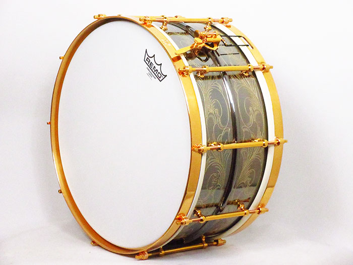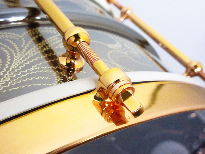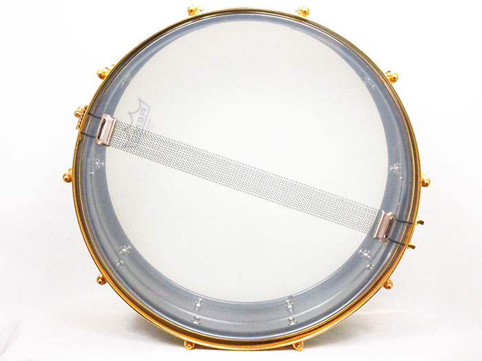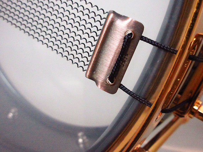 0.8mmのブラスシェルを採用し高い剛性を可能にしています。3mm厚のソリッドブラスフープを搭載することにより、シェル本来の持ち味を最大限まで存分に引き出し、ブラス特有の華やかさを露呈させます。またサイドヘッドが共鳴しワイヤーを振動させるまでの一連の流れに滞りはなく、ピアニッシモからフォルテッシモまで全てその通りに奏でます。