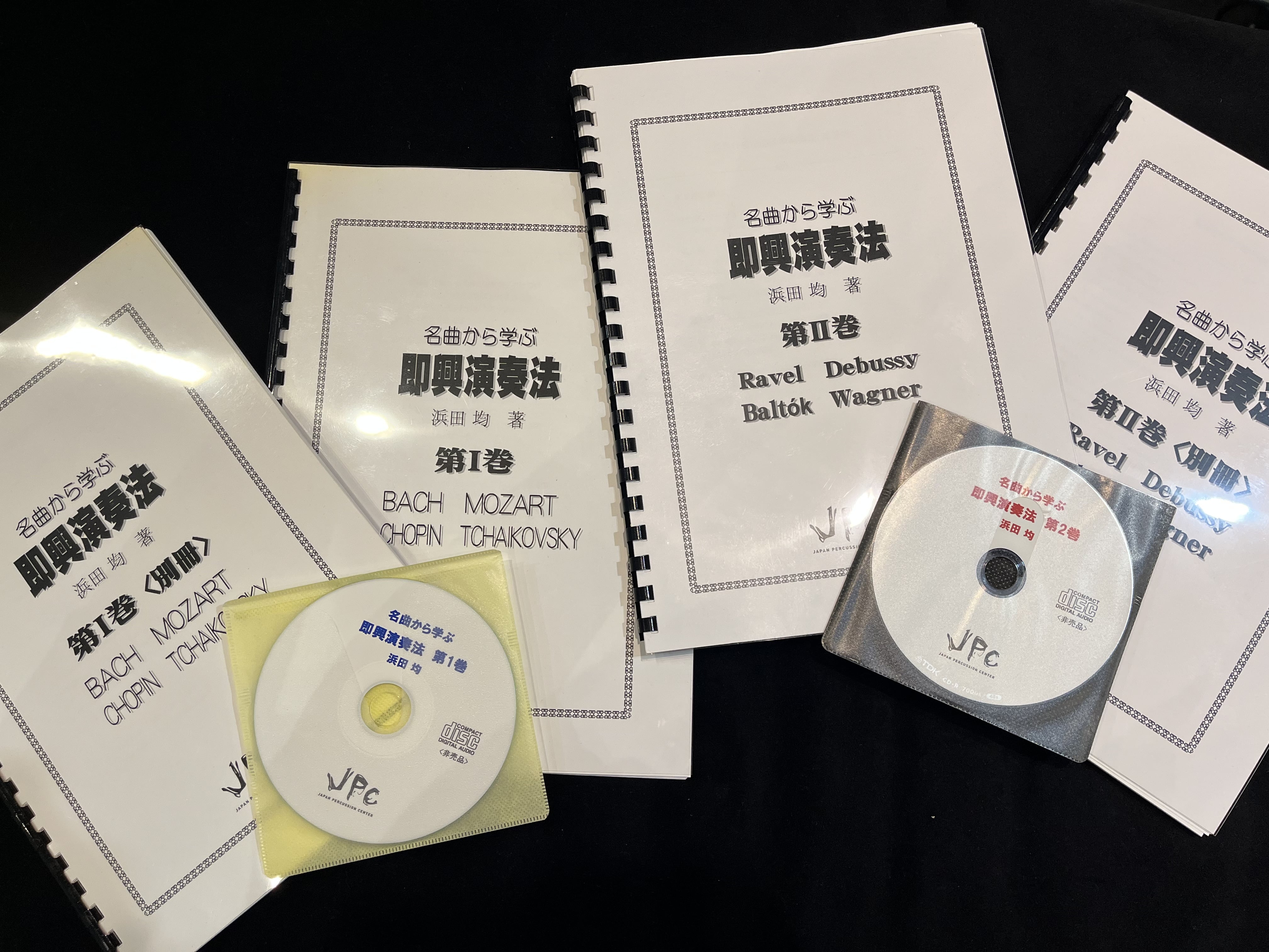名曲から学ぶ即興演奏法第Ⅱ巻、名曲から学ぶ即興演奏法第Ⅱ巻<別冊>、ディスクの6点がセットになっております。