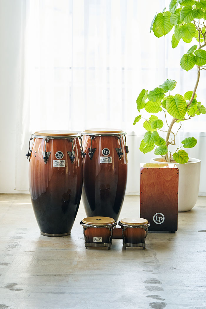 コンガ・ボンゴ単体でのご購入も大歓迎ですが、トーンバランスと同じ装飾の楽器を使用することで、アンサンブル時のまとまりとステージ上での見た目に統一感が生まれ、音楽全体の響きが洗練され、特にブラックフェイド塗装×ブラックニッケルハードウェアのデザインは高級感を際立たせます。