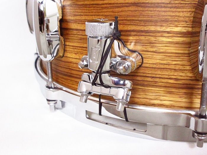 本モデルはとても固い木材特性を持つゼブラウッドを採用し、更にそのシェル内面の上下エッジ部分に、同じゼブラウッド材を使ったサウンド・フォーカス・リングを装着。その優れた振動特性を損なうことなくシェルの剛性を高めることで、音の立ち上がりが良くハイ・ピッチにした時も中音域が失われる事が無い、シェルの鳴りを実感できるスネアドラムに仕上げました。
