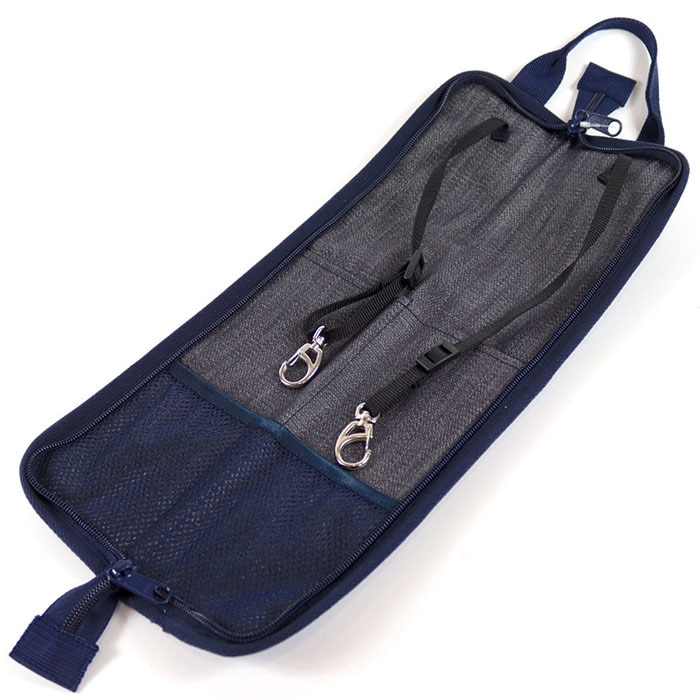 ドラムのテンションボルトに掛けるストラップとチューニングキーなどの小物を入れるメッシュポケット付き。