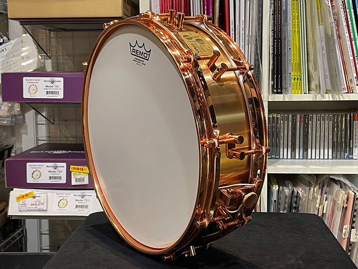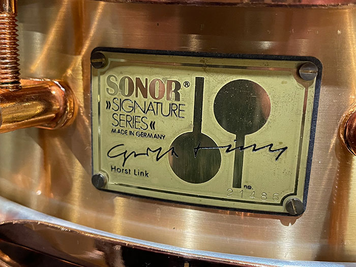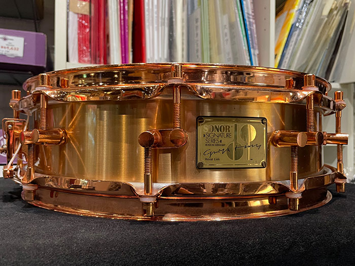 SONORの最高傑作であるシグネイチャーシリーズ初期型HLD-593ベルブロンズでございます。1987年HLD590 8インチのみで発売開始、1989年よりHLD593の4インチが発売され1994年まで製造。コパーメッキのトリプルフランジフープ搭載は初期のみ選択できており希少な逸品となっております。トップ側が3mm、ボトム1.8mm厚と異なっておりこのスネアのサウンドメイクに欠かせないフープとなっています。