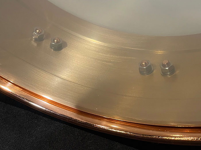 ブロンズを鋳造してから削り出す製法で、エッジの部分の厚さは5mmと分厚く重量は約7キロほどあります。全体的に細かなキズやメッキ小傷などありますがサウンドに影響するようなシェルの歪みやヘコミは一切無く現状使用に問題ございません。