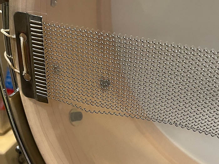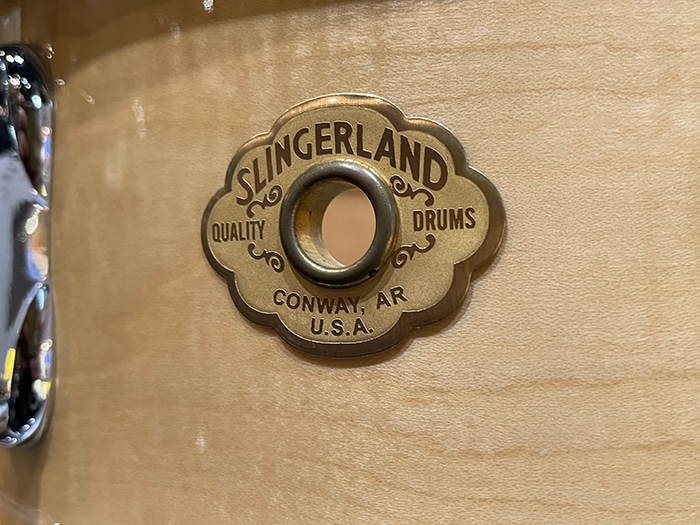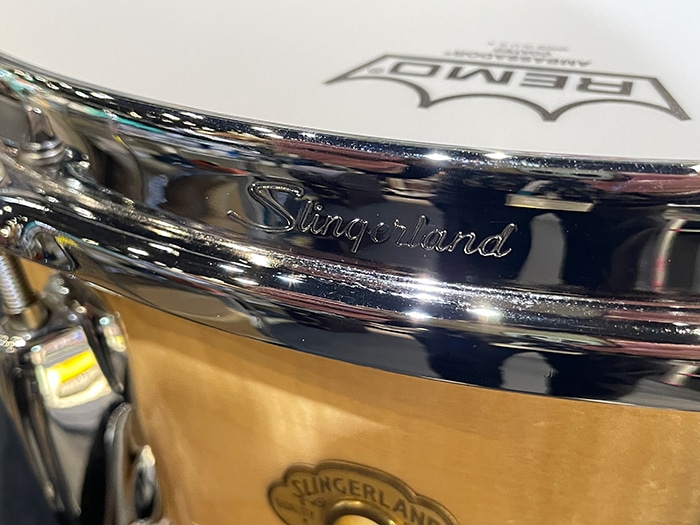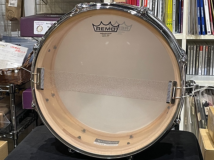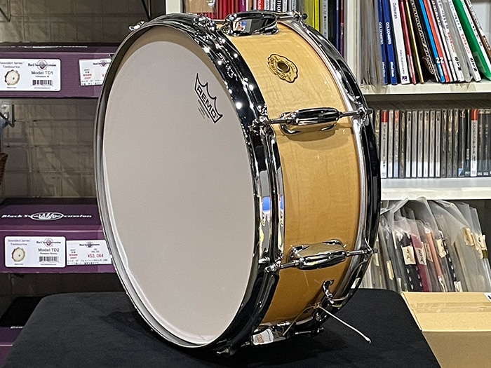 単板メイプル、リムショットカウンターフープが特徴で、国内入荷の頻度も少なく今では稀なアイテムとなっています。サウンドは細かいロールでも粒立ちが良くまとまりのあるのが特徴です。オープンリム、クローズリムショット時には乾いた少々タイトなサウンドが感じられます。フープにある刻印がたまりません。