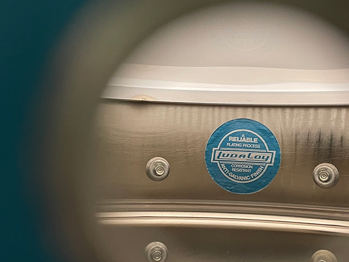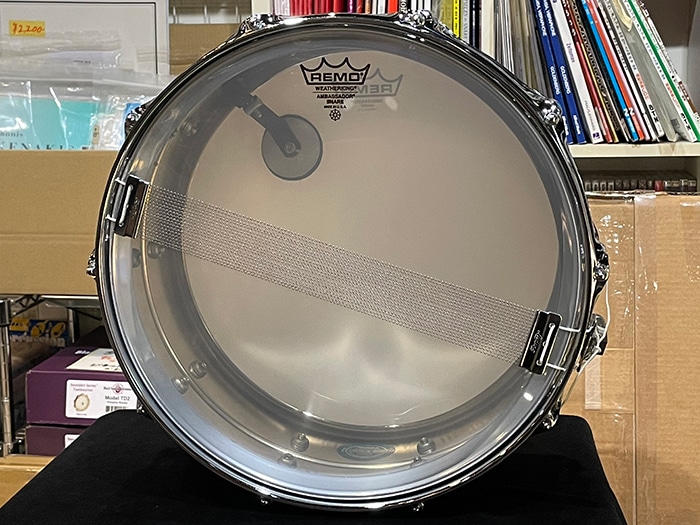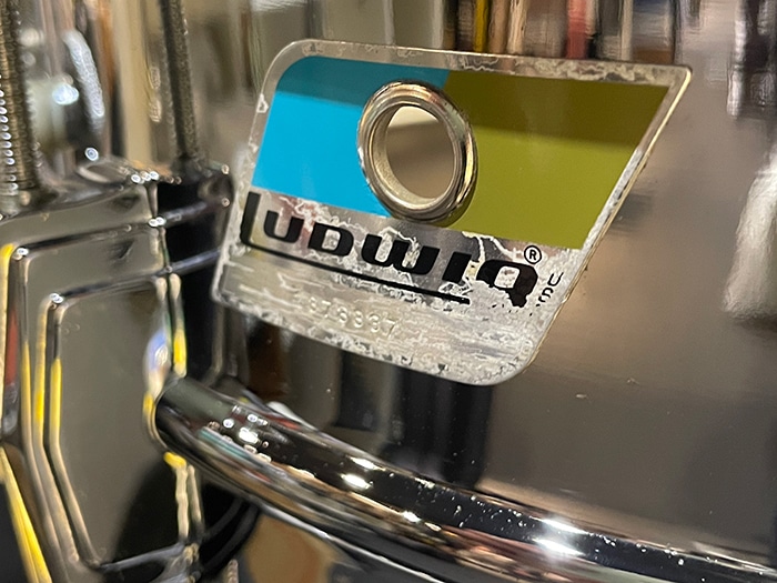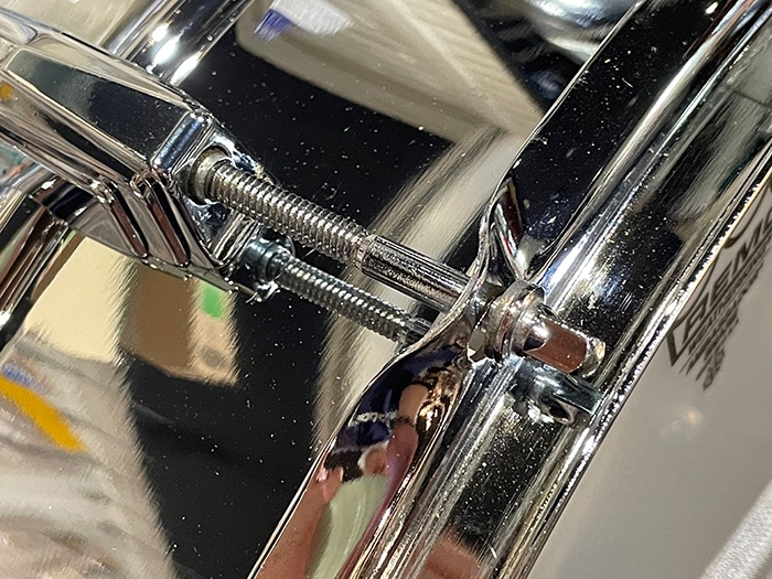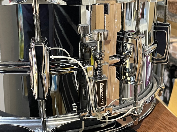 バット部は70S P-32を搭載し止めネジも生きています。スナッピーワイヤーもオリジナル1930 18本を装着、トップヘッドはREMOコーテッドアンバサダー、Ludwigスネアの中で重要な役割をするテンションボルトワッシャーはブラス製のオリジナルで高音域の倍音成分を緩和します。