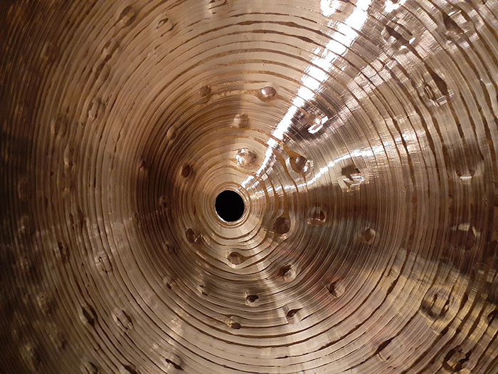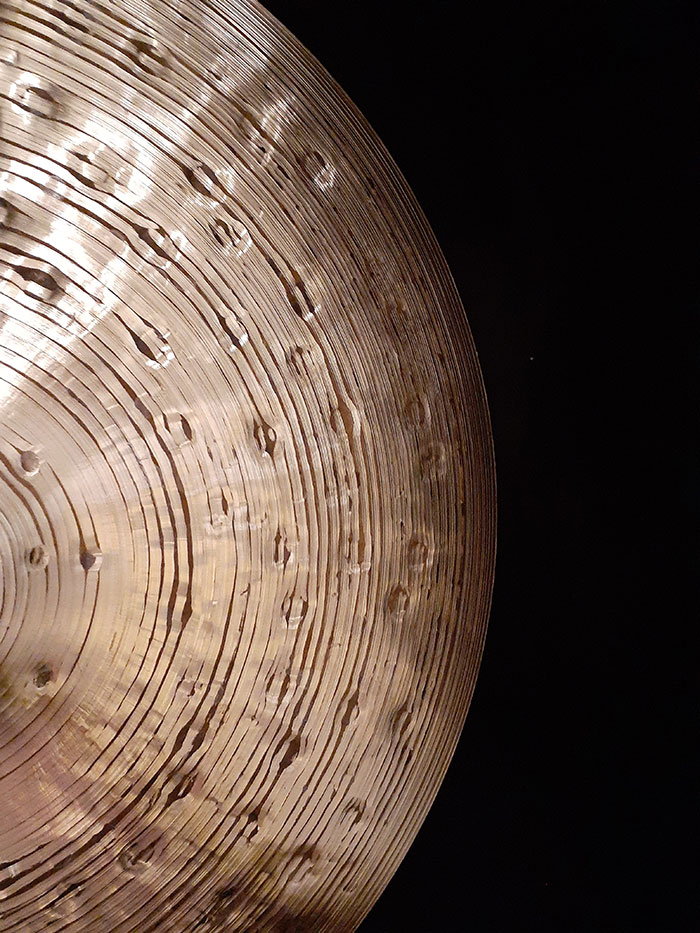 追加ハンマリングで表面にいくつもの深い窪みができ、このハンマリングと表裏全体に施したレイジング加工が相まって、クリアかつドライなスティックアタックと、それを包み支える豊かな低音を生み出しています。
