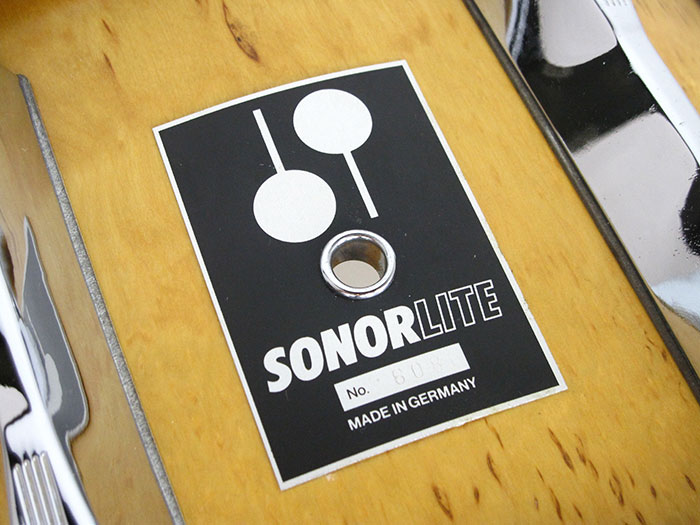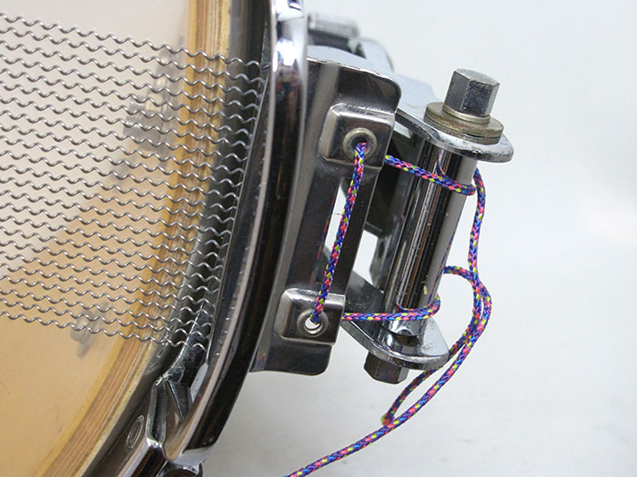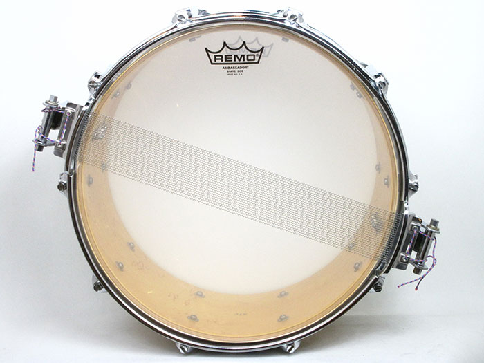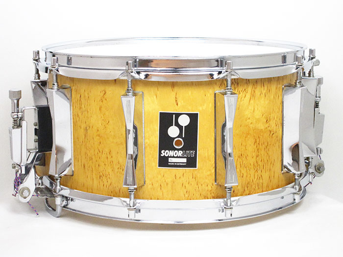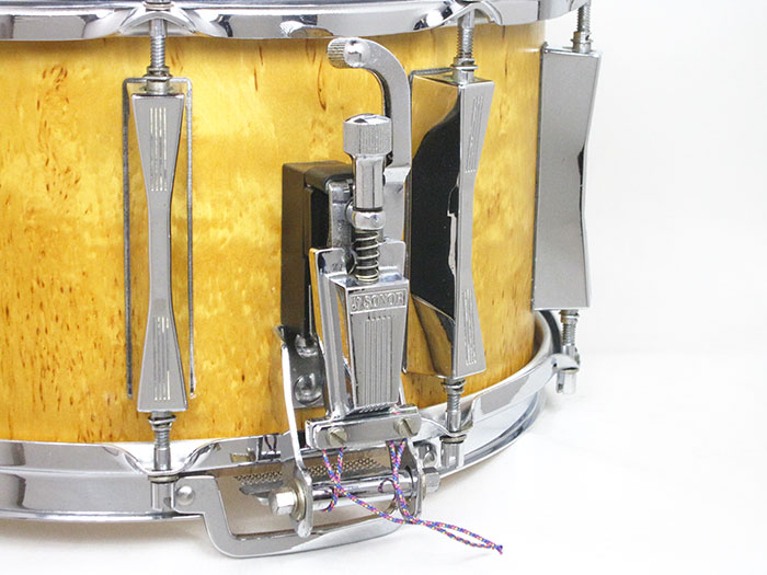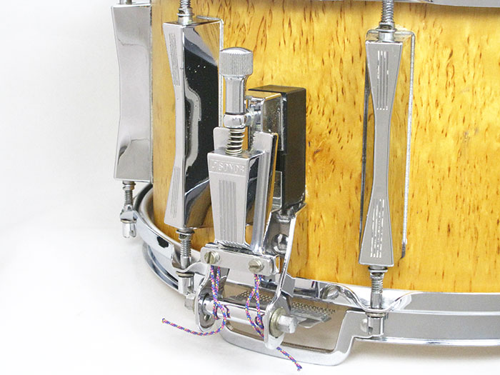 7mm12プライとソナーラインナップの中では薄めで重量も比較的軽いスネアです。フープはシームレスタイプのトリプルフランジフープで、トップは3mm、ボトムは1.8mmと異なる厚みのオリジナルフープでございます。スナッピーワイヤーもオリジナルでフェローマンガンスティールワイヤー24本全面当たりでヨレはありますがまだご使用できます。ストレイナー、バット部はどちらからでもワイヤー調節のできるスローオフIIとなっています。化粧板のスカンジナビアンバーチも程よく木目が出ておりエキゾチックな雰囲気を醸し出しています。
