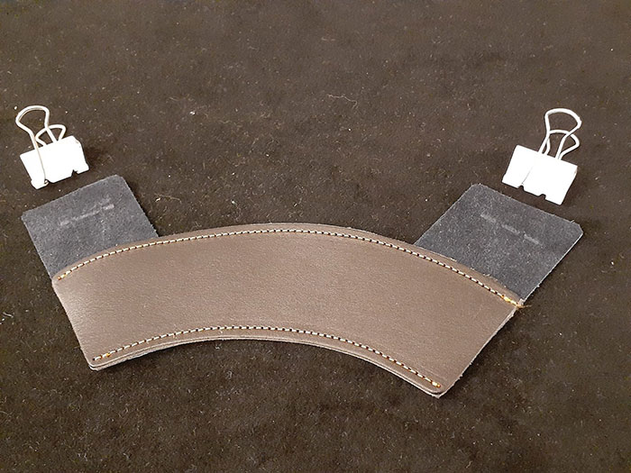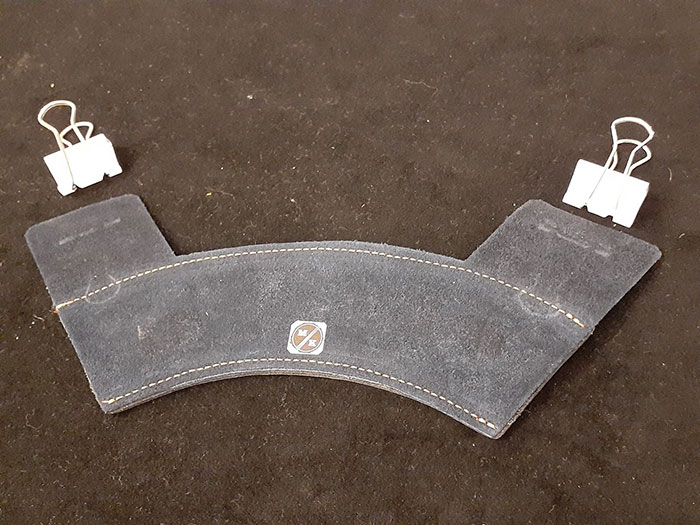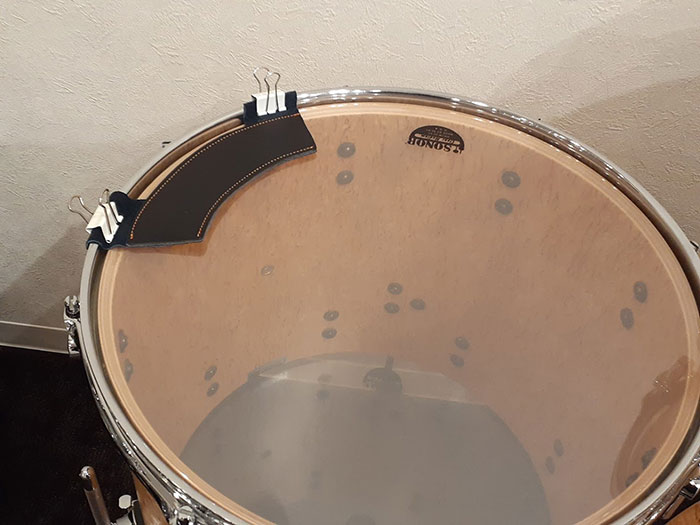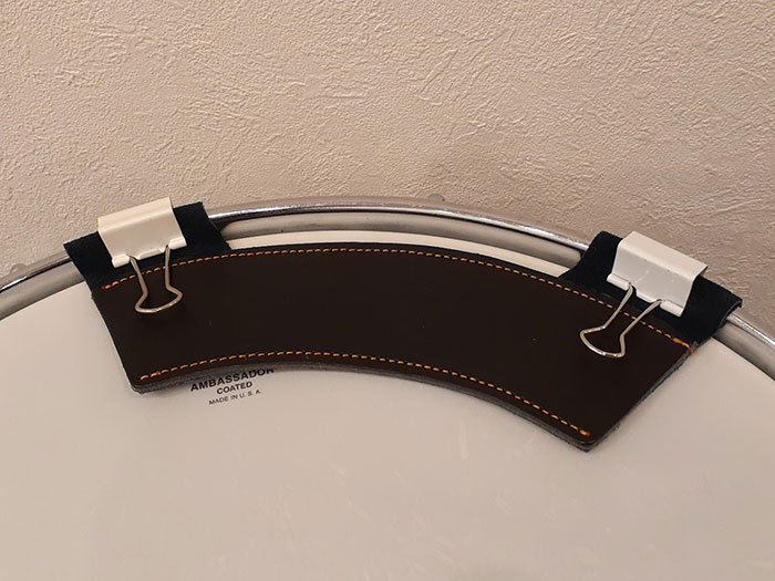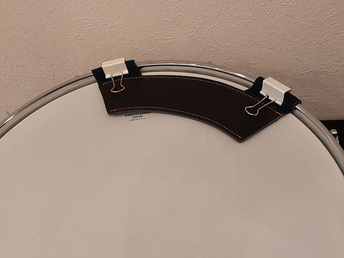 両サイドクリップで固定することで浮き上がりにくい牛革製のミュート。