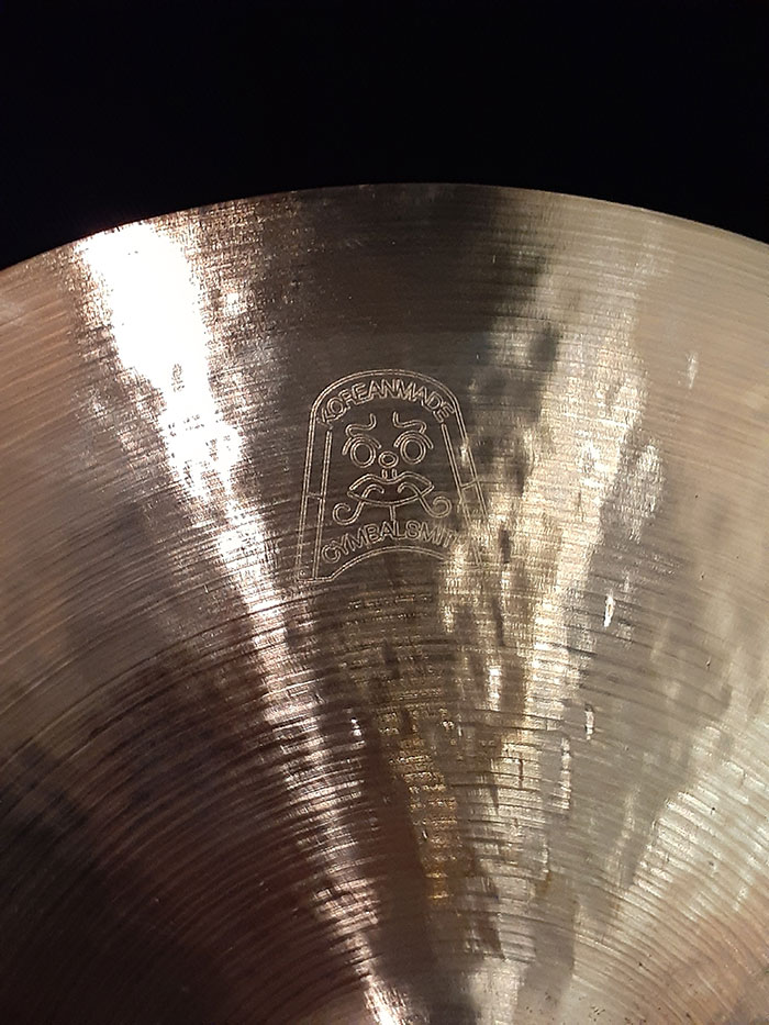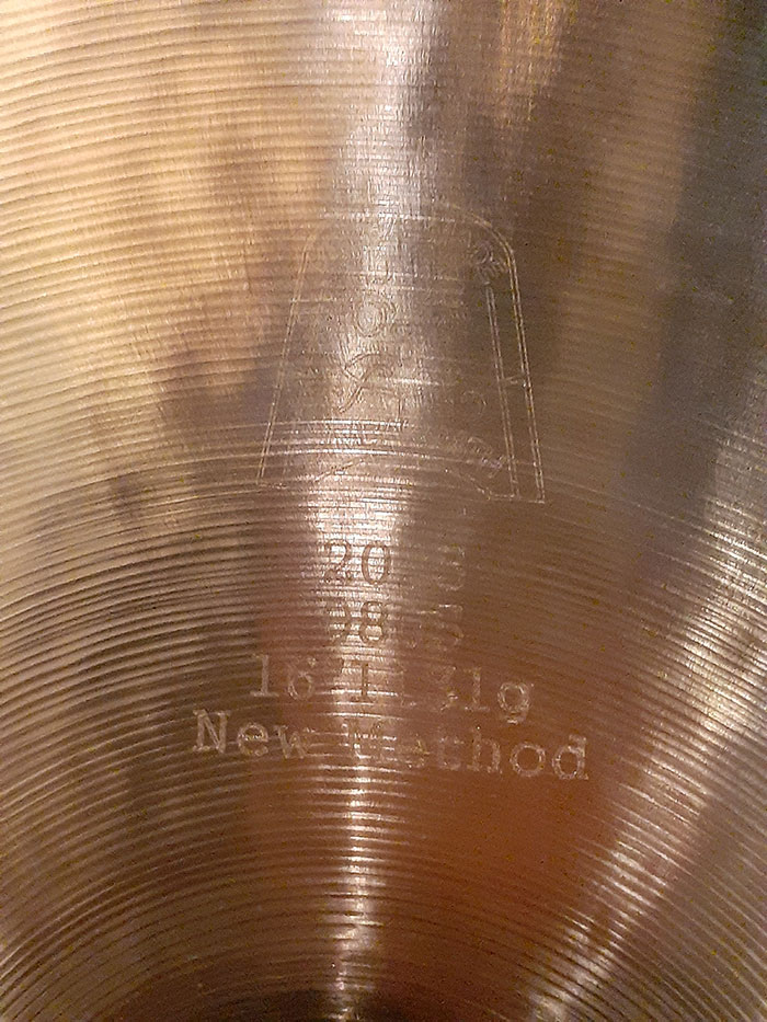 シンバル裏側にはブランドロゴ、製作年、シリアルナンバー、サイズ、ウェイト、品名の刻印がうっすら入っております。
