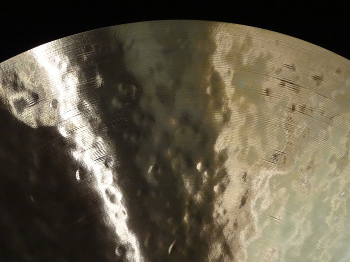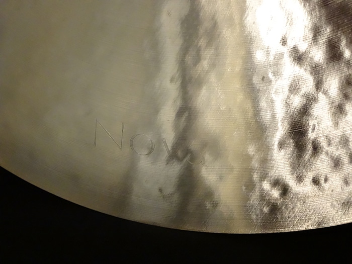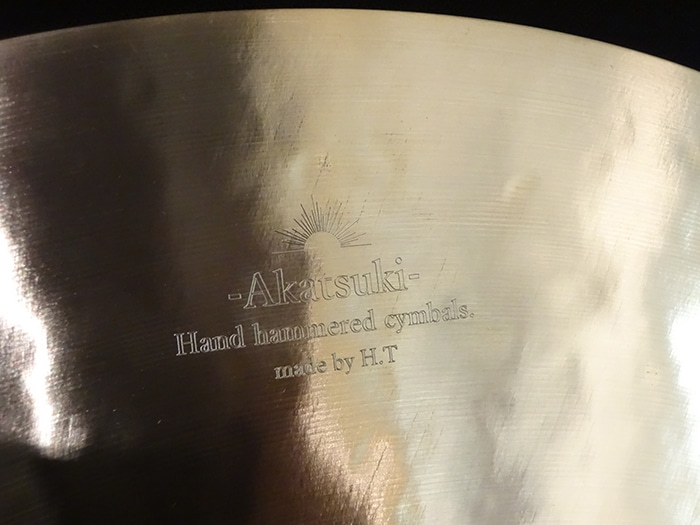 こちらのNova(ノバ)シリーズは浅めのレイジングにより成型されており、カップを小さくすることによりコツコツとした明瞭な粒立ちを実現。しかも無数の計算されたハンドハンマリングによりそのサウンドは丸みがあり、楽曲に馴染みやすいサウンドです。 こちらの個体、ウェイトも2101gと薄すぎることもなく、ジャズだけでなくその他幅広いジャンルで使用できる仕様になっております。 試奏されたジャズドラマーの方より、 『ピング音もしっかりしていますが、ピング音の後の余韻のピッチがウッドベースの音域とかぶらずに、 いいピッチで鳴っているので実践で使えるシンバルですね』というコメントもいただきました。 エッジ周辺にはオリジナルブランドロゴ『-Akatuki- Hand hammered cymbals.made by H.T』と刻印あり。(画像参照) シンバル表面には、漢字で『Akatsuki 暁』と日本らしく控えめにプリント表記されています。 今後、メイド・イン・ジャパン・シンバルとして世界中に広がっていく、シンバルブランドの貴重な初期ロッドになることは間違いございません。 *こちらのシンバルは1枚、1枚時間をかけて製造されているため大量生産はしておりません。 ご了承くださいませ。