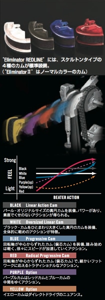 標準装備の4タイプとオプションの2タイプ、計6つのカムを自由に付け替えることにより、全く異なるアクションのフィールを味わうことができる斬新な機能。カムはそれぞれ色分けされ、ひと目で好みのタイプを識別できる。ブラックが標準装備で、ホワイト、ブルー、レッドが付属。オプションでパープル、イエローもラインナップ。