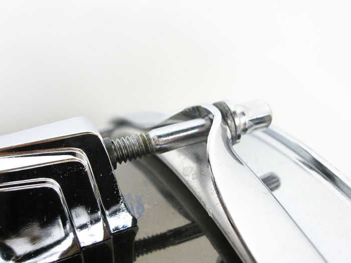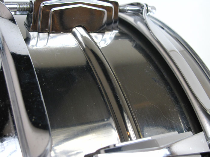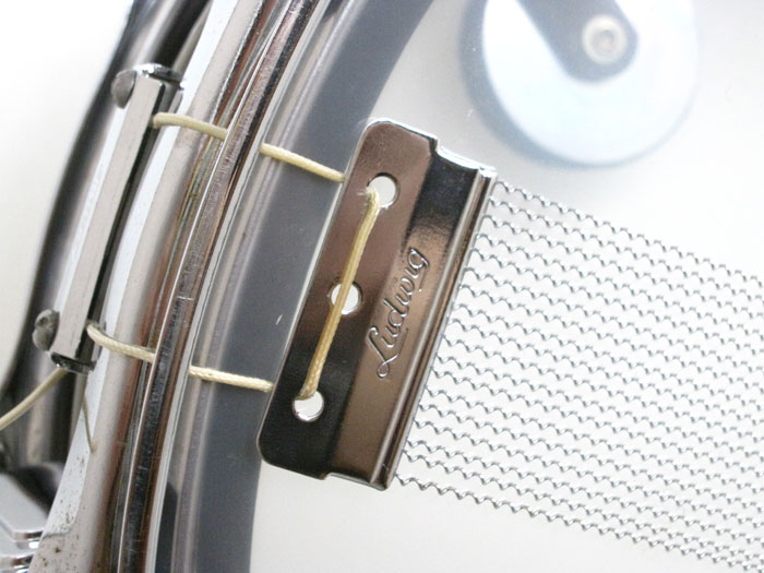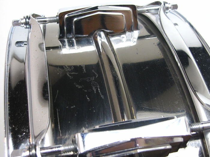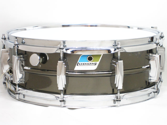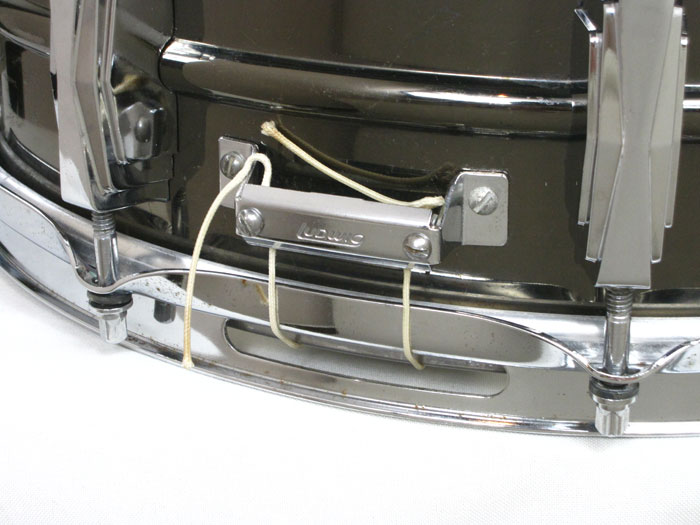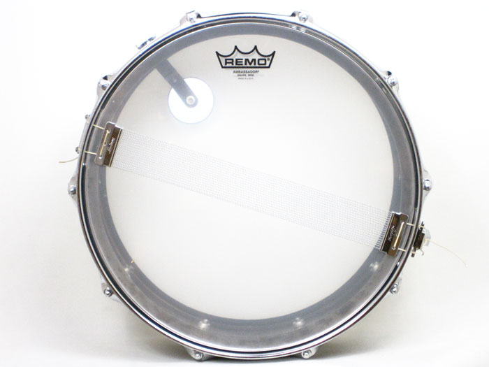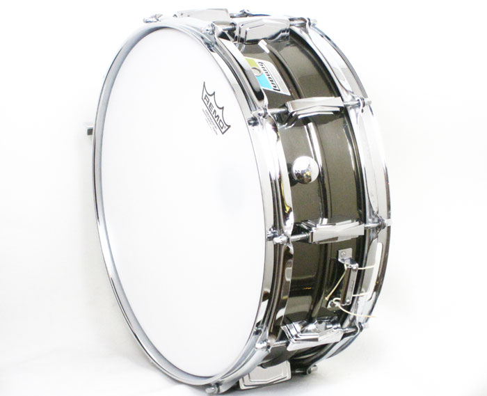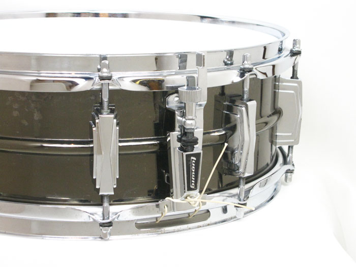 トップ・ボトムフープ、ストレイナースイッチ、バット、内蔵ミュート、ラグ、テンションボルト、スナッピーワイヤー全てオリジナルパーツを装着しています。所々ブラックニッケルが剥がれてくすんでいます。良い個体で音量がありイエローブラスのウッドサウンドが特徴です。 (仕様) サイズ:14"x5" シェル:シームレススパンブラス フィニッシュ:ブラックニッケル フープ:1,8mmトリプルフランジ 10テンション スイッチ:70s P85ブラックフェイス バット:70s P32 スナッピー:70s L-1930 ヘッド:REMO コーテッドアンバサダー スネアサイドアンバサダー シリアルNo:1620580