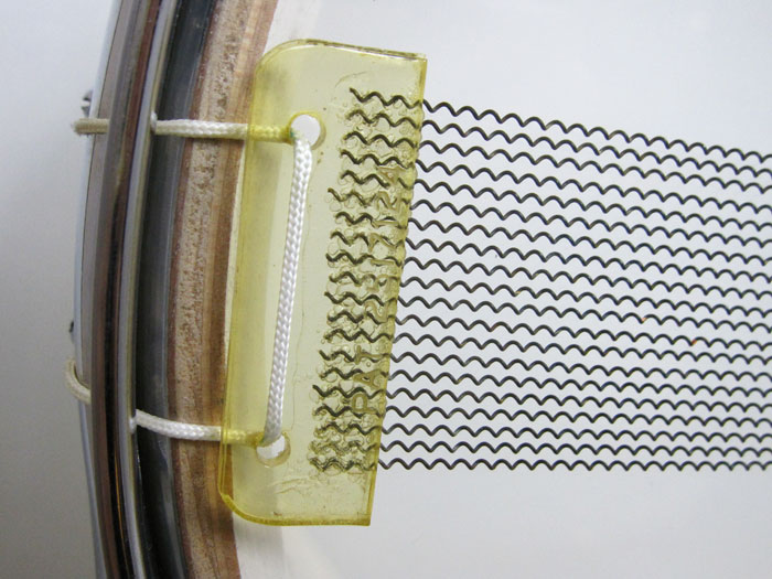内蔵マフラーはベースボールバットで白フェルト、ラグ、ボルト共にオリジナルでございます。P-83のストレイナースイッチ、バッド側はP-32、スナッピーは60's プラスティックエンドタイプの20本ワイヤーでややよれていますが貴重ですので装着。ヘッドはREMOコテッドアンバサダーに交換しております。