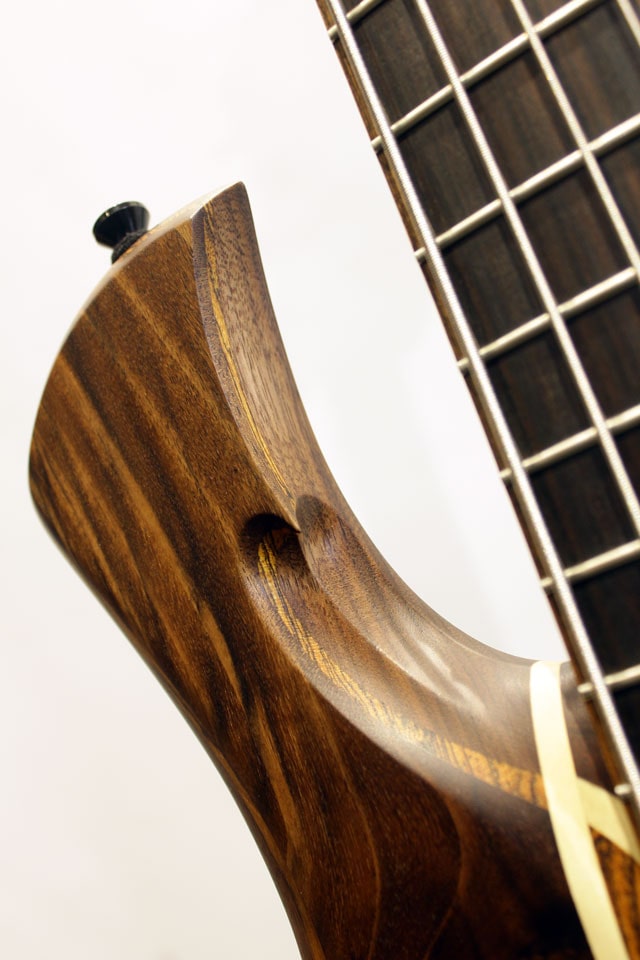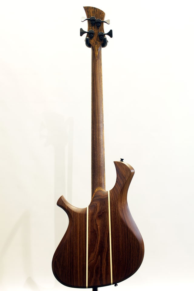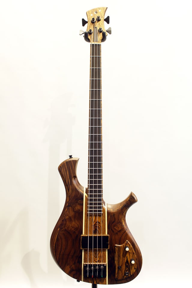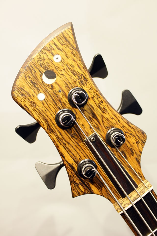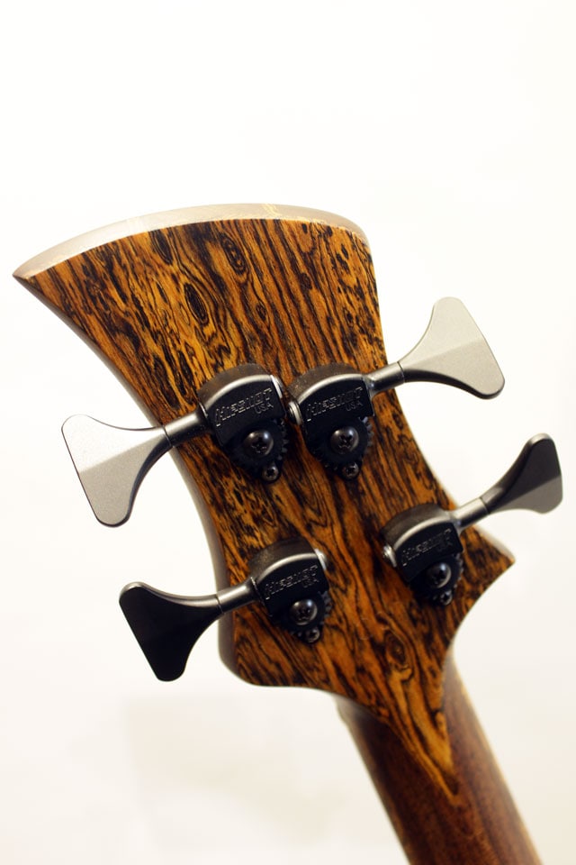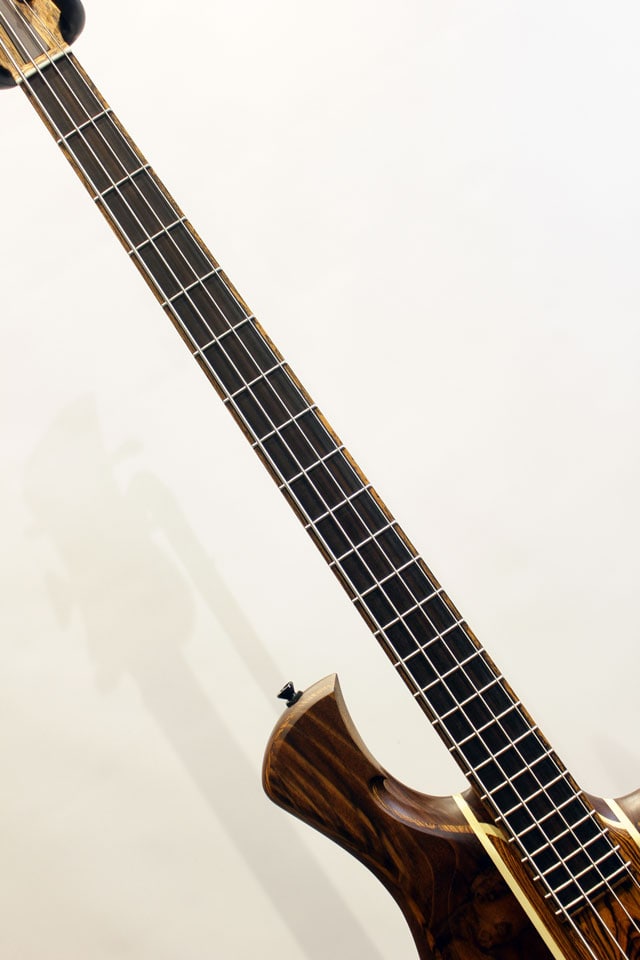 この度入荷したThe Double Bit 4stは、ウォルナットと主として構成した3plyボディ。ディープジョイントされたセットネック構造のマホガニーネック/エボニー指板。Kent Armstrong MMピックアップを搭載したパッシブモデル。木目の栄えるボーコテやホーリーウッドをウッドバインディング等の装飾材に使用。数多のウッドマテリアルの音響特性や木目を最大限に生かし構築しております。楽器と言う道具に留まらない芸術的要素も含まれたユニークなモデルです。