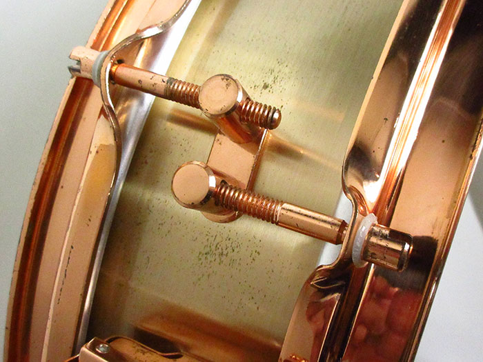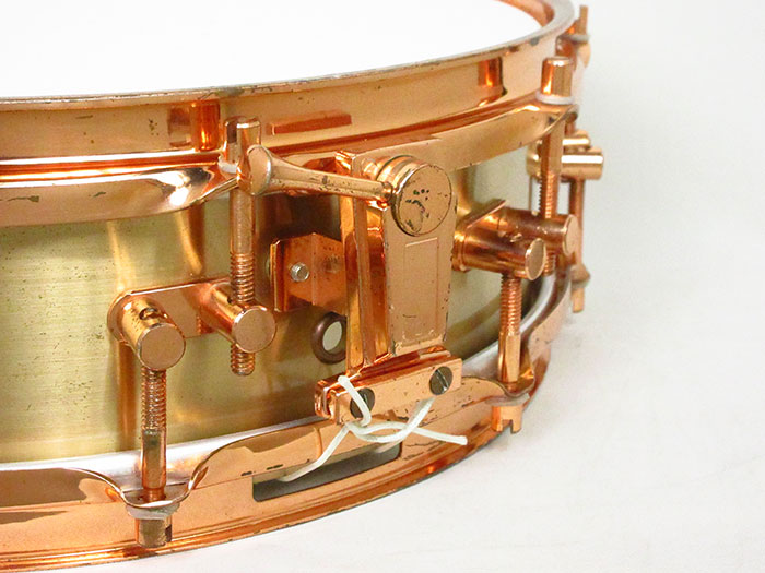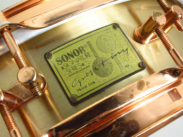 SONORの最高傑作であるシグネイチャーシリーズ初期型HLD-593ベルブロンズでございます。1987年HLD590 8インチのみで発売開始、1989年よりHLD593の4インチが発売され1994年まで製造。コパーメッキのトリプルフランジフープ搭載は初期のみ選択できており希少な逸品となっております。トップ側が3mm、ボトム1.8mm厚と異なっておりこのスネアのサウンドメイクに欠かせないフープとなっています。