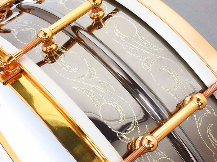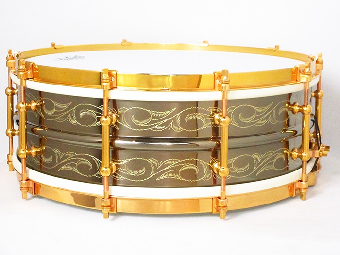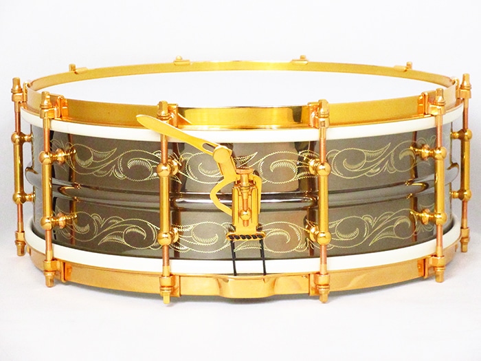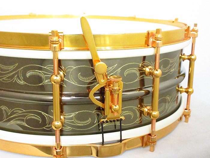 Ludwig社の名器「Black Beauty Deluxe」の”Scroll”デザインをイメージした手彫り彫刻が施されており、まさに芸術品といえる1台に仕上がっております。