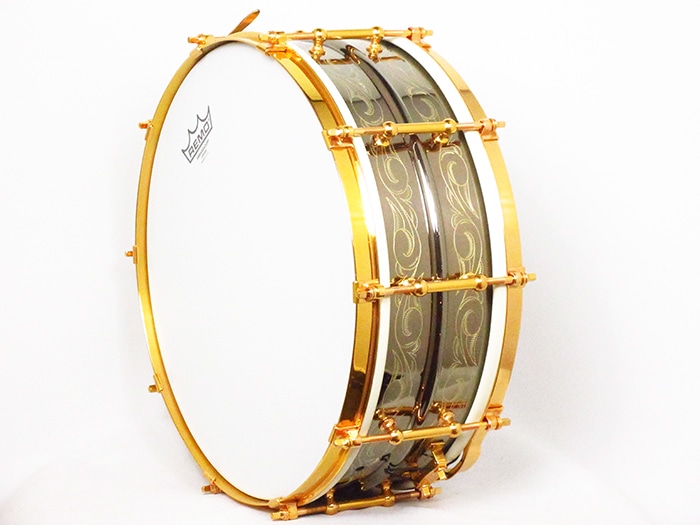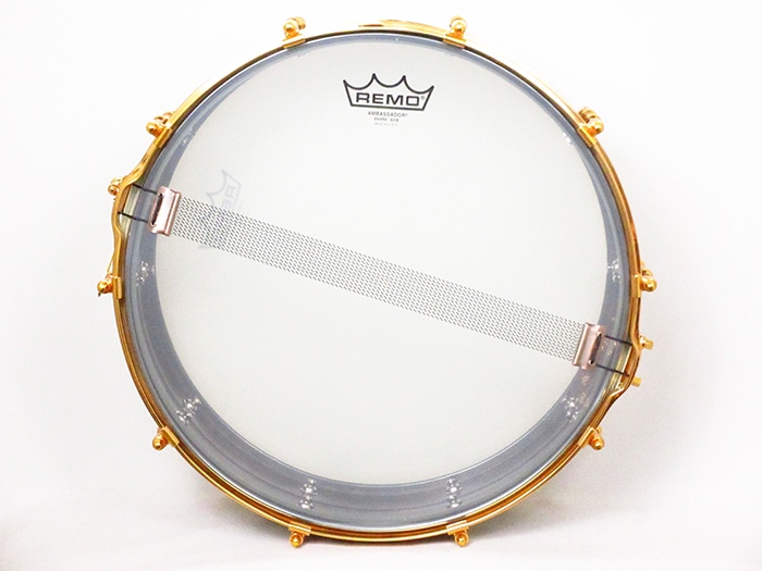 0.7mmと薄めのブラスシェルながら高い剛性を可能にしています。2mm厚のシングルフランジフープを搭載することにより、シェル本来の持ち味を最大限まで存分に引き出し、ブラス特有の華やかさを露呈させます。またサイドヘッドが共鳴しワイヤーを振動させるまでの一連の流れに滞りはなく、ピアニッシモからフォルテッシモまで全てその通りに奏でます。