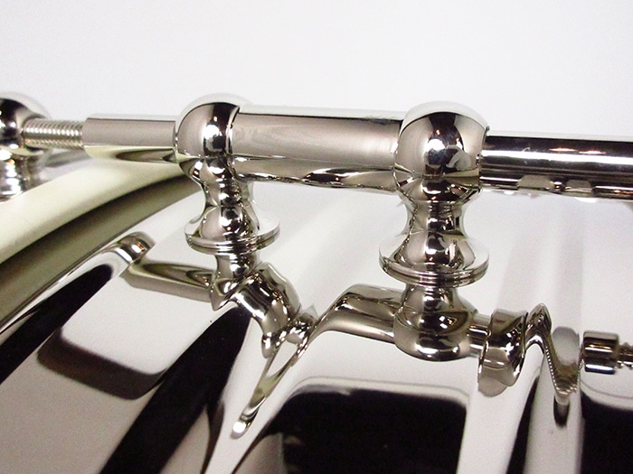 0.7mmと薄めのブラスシェルにスタンダード・ドレスナー・ベアリング・エッジを採用。ドレスナータイプの独創的なフープは、シェル本来の持ち味を最大限まで存分に引き出し、ブラス特有の華やかさを露呈させます。シェルの振動率が極限まで高く太鼓自身の鳴りに遜色はありません。またサイドヘッドが共鳴しワイヤーを振動させるまでの一連の流れに滞りはなく、ピアニッシモからフォルテッシモまで全てその通りに奏でます。