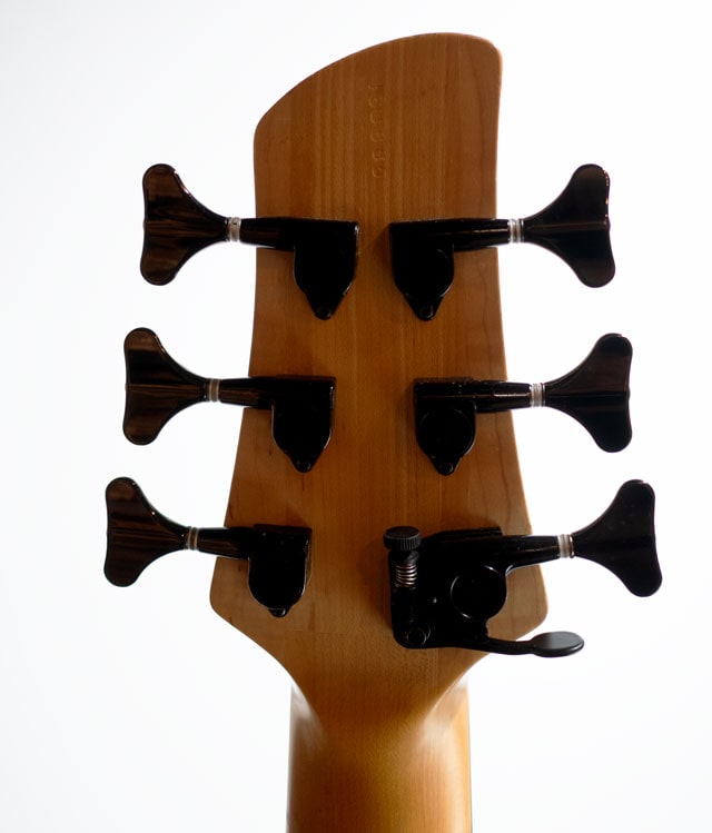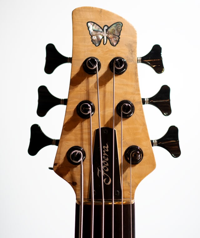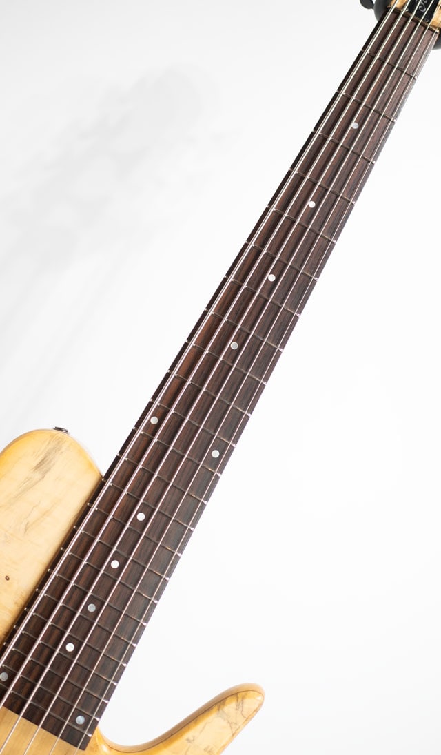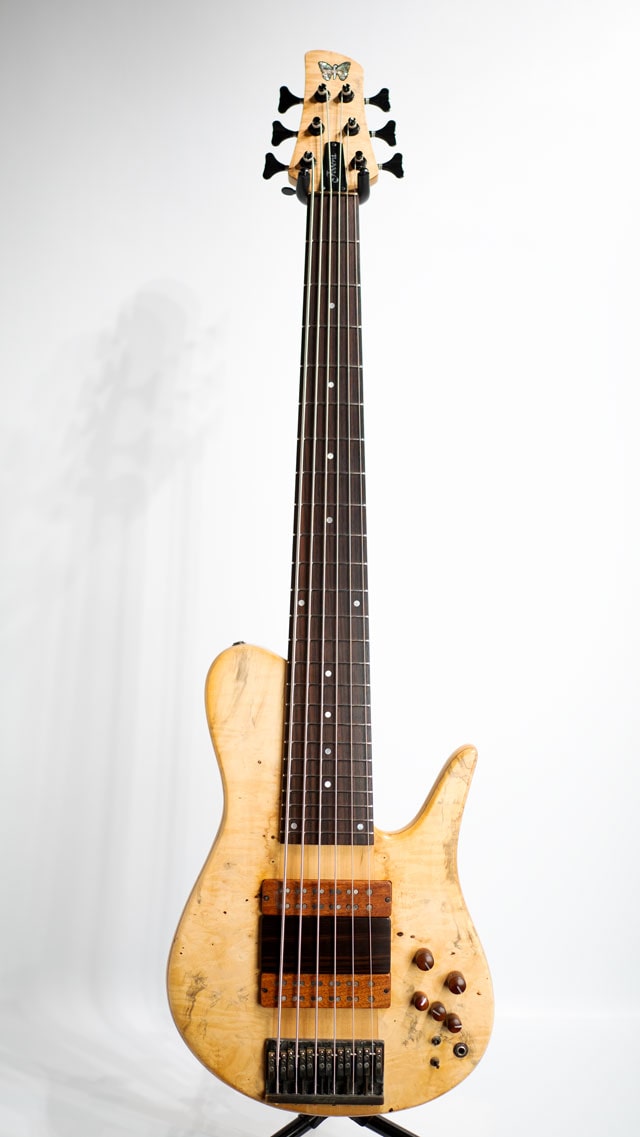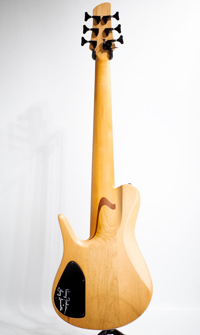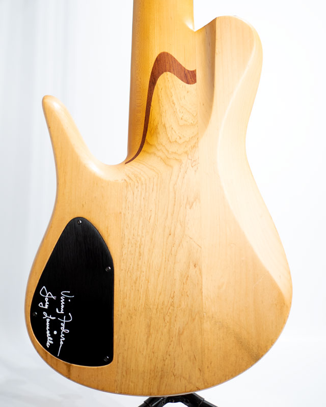 シングルカットシェイプの代表格とも言えるインペリアル。ボディとの接合箇所が多い分、ベース全体がしっかり鳴っており倍音感も豊かに含んだ厚みのあるサウンドが印象的です。チェスナットトップ&アルダーバックのラミネイトウィングボディ、センターコアはアッシュをセレクトしております。スルー構造の3pcメイプルネック/ローズ指板。ダンカンカスタムピックアップ&マイクポーププリアンプのコンビネーションになります。グリップは非対称ネックになっており、フィンガリングもスムーズに行えます。スケールは36インチのエクストラロングになり、Low-Bのテンション感も申し分ありません。6弦ペグのD-Tunerは後から交換された可能性がございます。またバックパネルにはヴィニー・フォデラ氏とセールスマンのジョーイローリセラ氏のサインが書かれております。